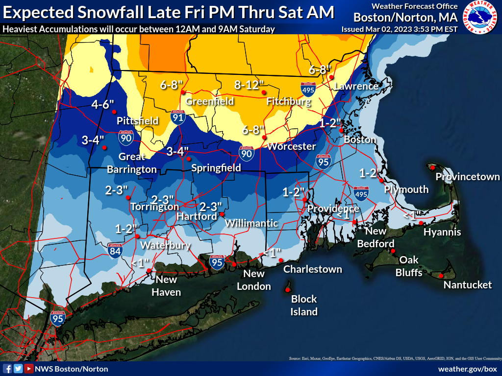 Good Afternoon All, Please find the latest briefing, regarding the potential for accumulating snow Friday night into Saturday, attached. Note that confidence has increased regarding impacts north of the I-90 corridor, with the highest confidence in impactful accumulations of snow north of Route 2 where more than 6" of snow is forecast to fall. A Winter Storm Watch has been issued for portions of Massachusetts north of I-90 and west of the I-495 corridors. Wind will also be of concern along the eastern MA coastline, where winds gusting between 40-50mph are likely on Saturday. While easterly winds will be strong, coastal flooding is not a concern as we will have low astronomical tides this weekend. Confidence in snow totals is lowest across the eastern MA coastline and south of I-90 as mixed precipitation such as sleet and rain will mix in after sunrise on Saturday. We would like to emphasize that the general timing of this system has not changed, with all impacts expected AFTER the Friday PM commute. Please let us know if you have additional questions. Kevin Cadima, Torry Gaucher, and Kristie Smith If you have any questions or would like more information, don't hesitate to contact us via this email address, on NWSChat <https://nwschat.weather.gov/>, or at the following: National Weather Service Boston/Norton, MA 46 Commerce Way Norton, MA 02766 508.622.3280 Website <http://www.weather.gov/boston> | Facebook <http://www.facebook.com/NWSBoston> | Twitter <http://www.twitter.com/NWSBoston>