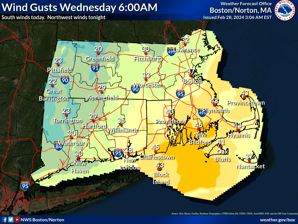 Good morning, Attached is our latest weather briefing. *Headlines:* - High Wind Warning remains in effect for Cape Cod and the Islands - Wind Advisory remains in effect for the rest of MA, RI, and CT. This includes central and western MA, which was previously under a High Wind Watch. Two surges of very strong to damaging winds remain in the forecast. The first surge will be today lasting into early this evening, with strong to damaging south winds. The second surge of wind will occur this evening into tomorrow morning, with strong to damaging west to northwest winds. Winds remain gusty at 30-45 mph through tomorrow evening. Heavy windswept rain will likely cause hazardous travel tonight. Rain briefly turns to snow, as temperatures crash into the 30s and 20s behind the cold front tonight. Any snow accumulations will be light, generally less than an inch. Subfreezing temperatures combined with any residual/leftover road moisture, may yield slippery travel tonight into tomorrow morning on untreated surfaces. Kyle Pederson and Matthew Belk If you have any questions or would like more information, please don't hesitate to contact us. You can reach us via: email: box.operations@noaa.gov phone: 508.622.3280 Slack/NWSChat 2.0 <https://nwschatws.slack.com/> (for approved partners) social media: Website <http://www.weather.gov/boston> | Facebook <http://www.facebook.com/NWSBoston> | Twitter <http://www.twitter.com/NWSBoston>