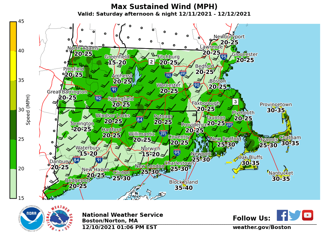 Good afternoon, We wanted to send a short update to the briefing sent this morning regarding the potential for strong wind gusts Saturday afternoon into Saturday evening. The latest guidance and trends reflect an increase in wind speed and wind gusts. While still in the *pre-decisional stage,* wind headlines are being considered for portions of southeast New England, including Cape Cod and the Islands. Despite the increase in speeds, only minor impact is currently envisioned. Attached are updated preliminary sustained wind speed and wind gust graphics (in MPH) based on the latest forecast trends. As the forecast is finalized, expect a full update to our briefing package which will be sent no later than 5 PM today. Thank You! Meteorologists: Andrew Loconto, Frank Nocera and Andy Nash If you have any questions or would like more information, don't hesitate to contact us via this email address, on NWSChat <https://nwschat.weather.gov/>, or at the following: National Weather Service Boston/Norton, MA 46 Commerce Way Norton, MA 02766 508.622.3280 Website <http://www.weather.gov/boston> | Facebook <http://www.facebook.com/NWSBoston> | Twitter <http://www.twitter.com/NWSBoston>