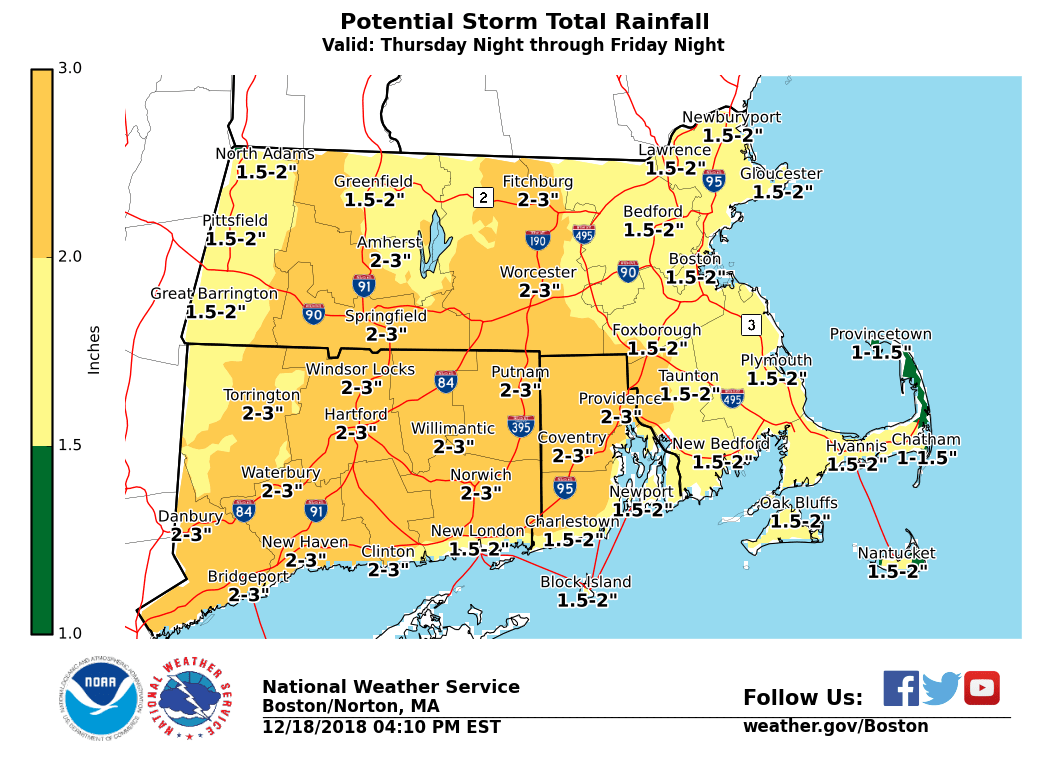 Good afternoon, We wanted to send a general heads-up email on a potential multi-hazard storm for late Thursday night into Friday night. No wintry precipitation/ice is expected, but heavy rainfall and associated flooding impacts, strong winds and minor coastal flooding are possible. Here are the details below. *What / Where / When ...* - Heavy rainfall across all SNE - Rain starts late Thursday night, with heaviest rainfall expected during much of the day on Friday and possibly lingering into Friday evening. - Rainfall amounts of 1.5 to 3 inches, with locally higher amounts possible. - Heavy rainfall will likely result in urban and poor drainage flooding, along with some river flooding as well. Moderate river flooding is possible if rainfall approaches 3 inches. - Strong southerly winds - The greatest risk for strong to damaging winds will be across SE New Eng, particularly RI and southeast MA and Cape/Islands during Friday possibly into Friday evening. - Potential for wind gusts over 50 mph. - If strong winds are realized, tree damage and isolated to scattered power outages will be possible. - Minor coastal flooding along the south coast - Mainly during the early Friday evening high tide. - Storm surge around 2 ft possible with 10+ foot seas just offshore. - Minor flooding possible along the shores of Narragansett Bay and Buzzards Bay, as well as splashover and minor flooding along ocean exposed south coastal beaches. *Uncertainty ...* - Heavy rainfall: High confidence that heavy rainfall will occur, but there is uncertainty with respect to where the axis of heavy rainfall will set up and timing of the heaviest rainfall. - Strong winds: Uncertainty with how strong the winds will get near the south coast and extent of any wind damage, and also the timing of the strongest winds. - Coastal flooding: There is uncertainty if there will be enough storm surge during the Friday evening high tide to produce minor flooding. More details will be provided during the next dew days. If you have any questions or would like more information, don't hesitate to contact us via this email address, on NWSChat <https://nwschat.weather.gov/>, or at the following: National Weather Service Boston/Norton, MA 46 Commerce Way Norton, MA 02766 508.622.3280 Website <http://www.weather.gov/boston> | Facebook <http://www.facebook.com/NWSBoston> | Twitter <http://www.twitter.com/NWSBoston>