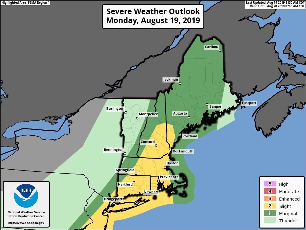 Good afternoon, Just wanted to give everyone a heads up on potential severe weather this afternoon and evening. SPC has upgraded the region to a slight risk for severe thunderstorms. The primary threat will be damaging wind gusts, but large hail is also possible. In addition,there is a risk for locally heavy rainfall with any string storms leading to a localized flood threat. The main timing threat is from 3 to 9 pm. If you have any questions or would like more information, don't hesitate to contact us via this email address, on NWSChat <https://nwschat.weather.gov/>, or at the following: National Weather Service Boston/Norton, MA 46 Commerce Way Norton, MA 02766 508.622.3280 Website <http://www.weather.gov/boston> | Facebook <http://www.facebook.com/NWSBoston> | Twitter <http://www.twitter.com/NWSBoston>