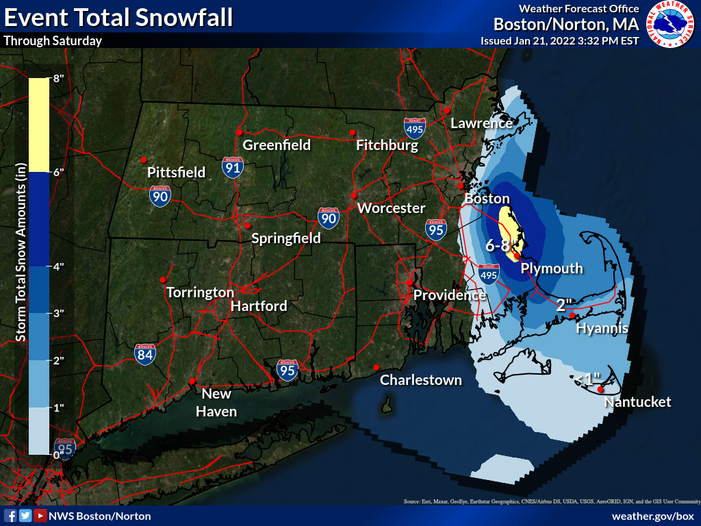 Good evening everyone, There have been no changes to the Winter Weather Advisories, which remain in effect for Barnstable and eastern Plymouth Counties until 4 PM Saturday. However, we have upped event totals to as much as local 6 to 8 inch amounts in eastern Plymouth County by Saturday afternoon (see attached map). Snowfall so far has been as high as 3 to 4 inches in spots. FYI, the criteria for a Winter Storm Warning is if an average of 8 inches falls in a 24 hour period. This is over a much longer period and those higher amounts are more localized, not common throughout the zone. So, that is why Advisories remain posted. -- Glenn Field and Kevin Cadima NWS - Boston/Norton If you have any questions or would like more information, don't hesitate to contact us via this email address, on NWSChat <https://nwschat.weather.gov/>, or at the following: National Weather Service Boston/Norton, MA 46 Commerce Way Norton, MA 02766 508.622.3280 Website <http://www.weather.gov/boston> | Facebook <http://www.facebook.com/NWSBoston> | Twitter <http://www.twitter.com/NWSBoston>