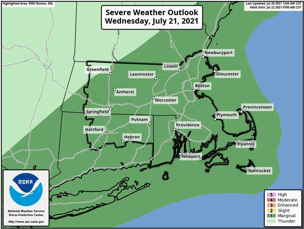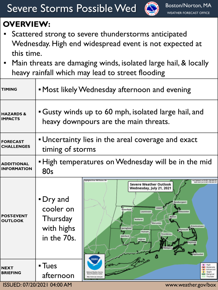 Good morning everyone, There is potential for a round of strong to severe storms to impact southern New England on Wednesday. Attached is a short-page briefing about the threat of damaging wind, isolated large hail, and local downpours. We will send our next email briefing by 5 PM today. If you have any questions, we can be reached via box.operations@noaa.gov or 508-622-3280. Thanks, Bryce Williams and Bill Babcock National Weather Service Boston/Norton, MA 46 Commerce Way Norton, MA 02766 508.622.3280 Website <http://www.weather.gov/boston> | Facebook <http://www.facebook.com/NWSBoston> | Twitter <http://www.twitter.com/NWSBoston>