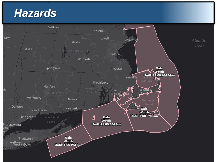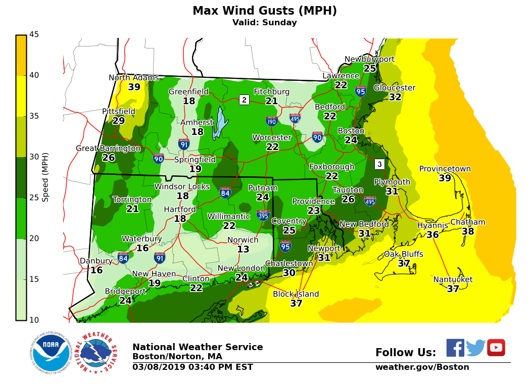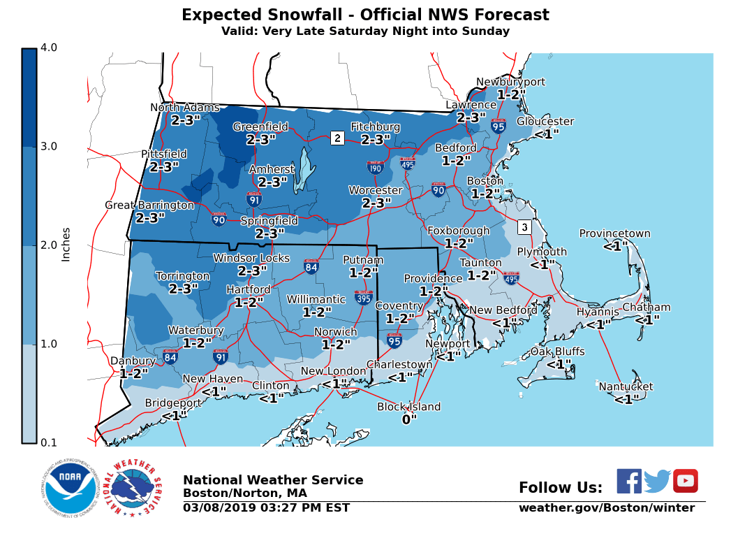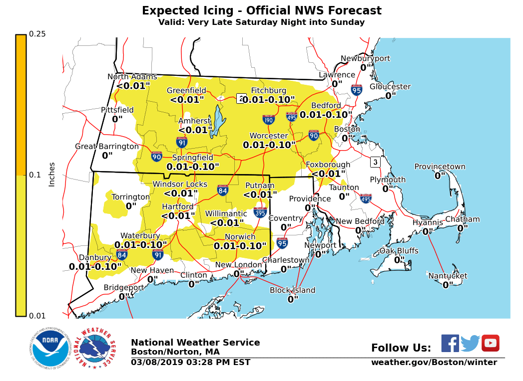 Good afternoon, Our next mixed winter precipitation event is expected during the early hours of Sunday morning through the afternoon. Details are below. *WHAT: * - Minor snow accumulations of a coating to 2 inches are possible with up to 3 inches in the Berkshires. This is followed by a period of sleet and freezing rain with ice accretion of a few hundredths, locally up to a tenth of an inch in the highest terrain. - GALE WATCHES have been issued for gusty winds picking up over the waters and along the coast. *WHEN/WHERE:* - Snow/sleet develops in most locations between 4 and 10 am Sunday. - Greatest risk for a few inches of snow will be near and north of the MA turnpike. This will be followed by a quick change to sleet and then rain along the coastal plain Sunday morning into the afternoon. A period of freezing rain/light ice accretion is possible during the transition across interior MA/northern CT before a change to rain in most locations. Bulk of the precipitation comes to an end by late Sunday evening. - Winds increase through the day and peak Sunday evening. *IMPACTS:* - Untreated roads/walkways may be slippery early Sunday morning into midday with the greatest risk across the interior high terrain. - Ice amounts are not expected to be high enough to result in any tree damage or power outage risk. - Most locations should rise above freezing by mid afternoon Sunday, but some areas across the interior high terrain of MA may still see temperatures hovering around freezing. Please let us know if you have any questions or concerns. Thank You Bryce Williams If you have any questions or would like more information, don't hesitate to contact us via this email address, on NWSChat <https://nwschat.weather.gov/>, or at the following: National Weather Service Boston/Norton, MA 46 Commerce Way Norton, MA 02766 508.622.3280 Website <http://www.weather.gov/boston> | Facebook <http://www.facebook.com/NWSBoston> | Twitter <http://www.twitter.com/NWSBoston>