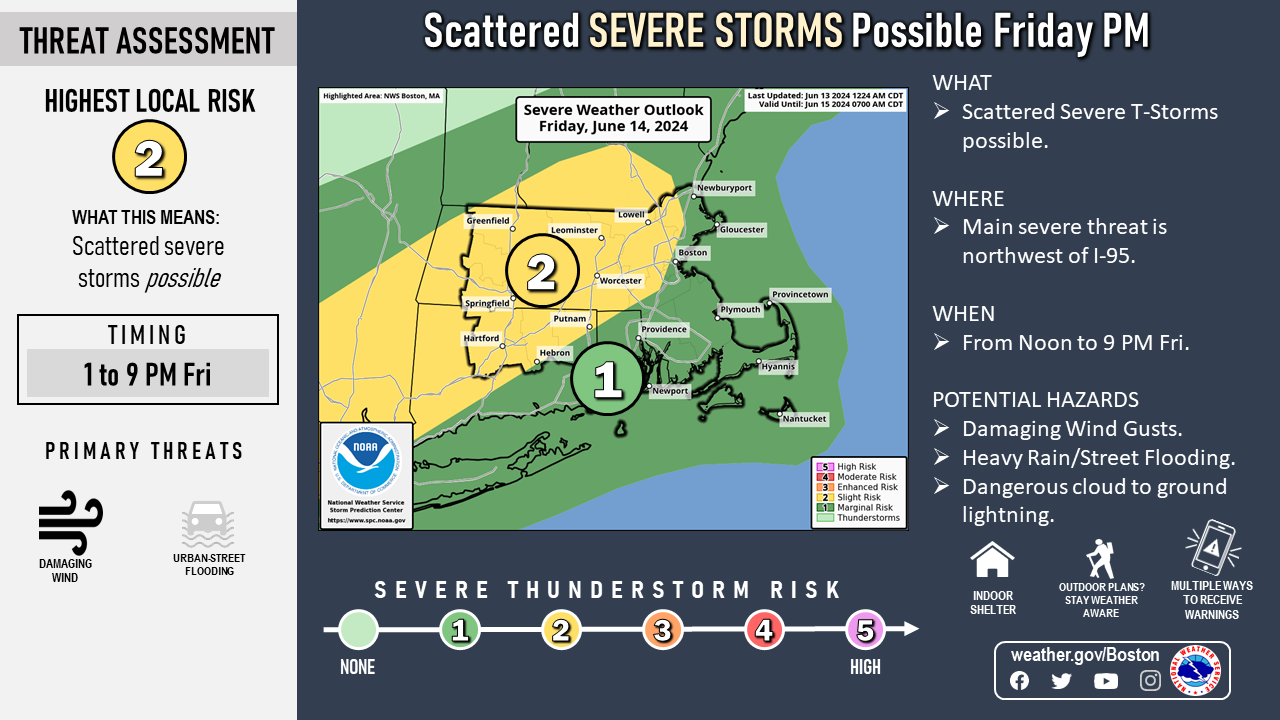 Good morning everyone Attached is the latest one-pager on the potential for scattered severe thunderstorms Friday afternoon and evening with the main risk northwest of the I-95 corridor. The main severe weather threat will be locally damaging wind gusts. In addition, torrential rain with any thunderstorms may result in urban street flooding...which may impact part of the Friday PM commute. Also, the potential for excessive heat and humidity continues next week. This begins next Tuesday and may continue through Thursday or Friday of next week. While it is a long way off...the potential for heat indices of 95-104 degrees are possible at times. It will also remain quite muggy at night...so that will also be a concern. Attached is the one-pager and also enlarged images of the Severe Weather Outlook for Friday and potential for excessive heat and humidity next week. We plan to issue an updated email by 6 pm this evening. Please let us know if you have any questions or concerns! Thank You Meteorologists: Hayden Frank and Kyle Pederson If you have any questions or would like more information, please don't hesitate to contact us. You can reach us via: email: box.operations@noaa.gov phone: 508.622.3280 Slack/NWSChat 2.0 <https://nwschatws.slack.com/> (for approved partners) social media: Website <http://www.weather.gov/boston> | Facebook <http://www.facebook.com/NWSBoston> | Twitter <http://www.twitter.com/NWSBoston>