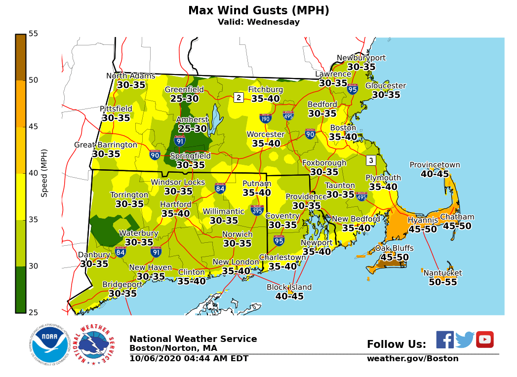 Good morning, A strong cold front will bring the threat for isolated strong to severe thunderstorms across portions of Southern New England. A Wind Advisory has also been posted for the Cape and Islands from Wednesday at noon to Thursday at 2 AM for both pre and post-frontal winds with gusts up to 50 mph. *What...*Isolated strong to severe thunderstorms with damaging winds. *Where...*Much of southern New England, but especially Cape Cod and the Islands, where a Wind Advisory has been issued. *When...*Wednesday afternoon into evening. *Concerns...*With trees still fully leaved across the region, strong winds could bring down trees and power lines. *Forecast confidence...*There is uncertainty in the coverage of damaging winds. Currently, the confidence is highest across the Cape and the Islands. Future shifts will monitor the need to expand the coverage. Rodney Chai and Matthew Belk If you have any questions or would like more information, don't hesitate to contact us via this email address, on NWSChat <https://nwschat.weather.gov/>, or at the following: National Weather Service Boston/Norton, MA 46 Commerce Way Norton, MA 02766 508.622.3280 Website <http://www.weather.gov/boston> | Facebook <http://www.facebook.com/NWSBoston> | Twitter <http://www.twitter.com/NWSBoston>