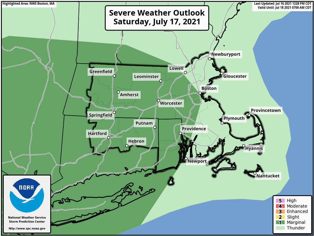 Good afternoon, Showers and a few thunderstorms are possible in Connecticut and adjacent parts of Massachusetts on Saturday. Some of the thunderstorms may produce strong wind gusts and downpours. Any downpours may lead to localized flooding. We have attached an image of the Severe Weather Outlook from the Storm Prediction Center for Saturday. We have also attached an image of the area coverage of the Flood Watch. This e-mail should be updated by 6 AM Saturday. If you have any questions or would like more information, don't hesitate to contact us via this email address, on NWSChat <https://nwschat.weather.gov/>, or at the following: National Weather Service Boston/Norton, MA 46 Commerce Way Norton, MA 02766 508.622.3280 Website <http://www.weather.gov/boston> | Facebook <http://www.facebook.com/NWSBoston> | Twitter <http://www.twitter.com/NWSBoston>