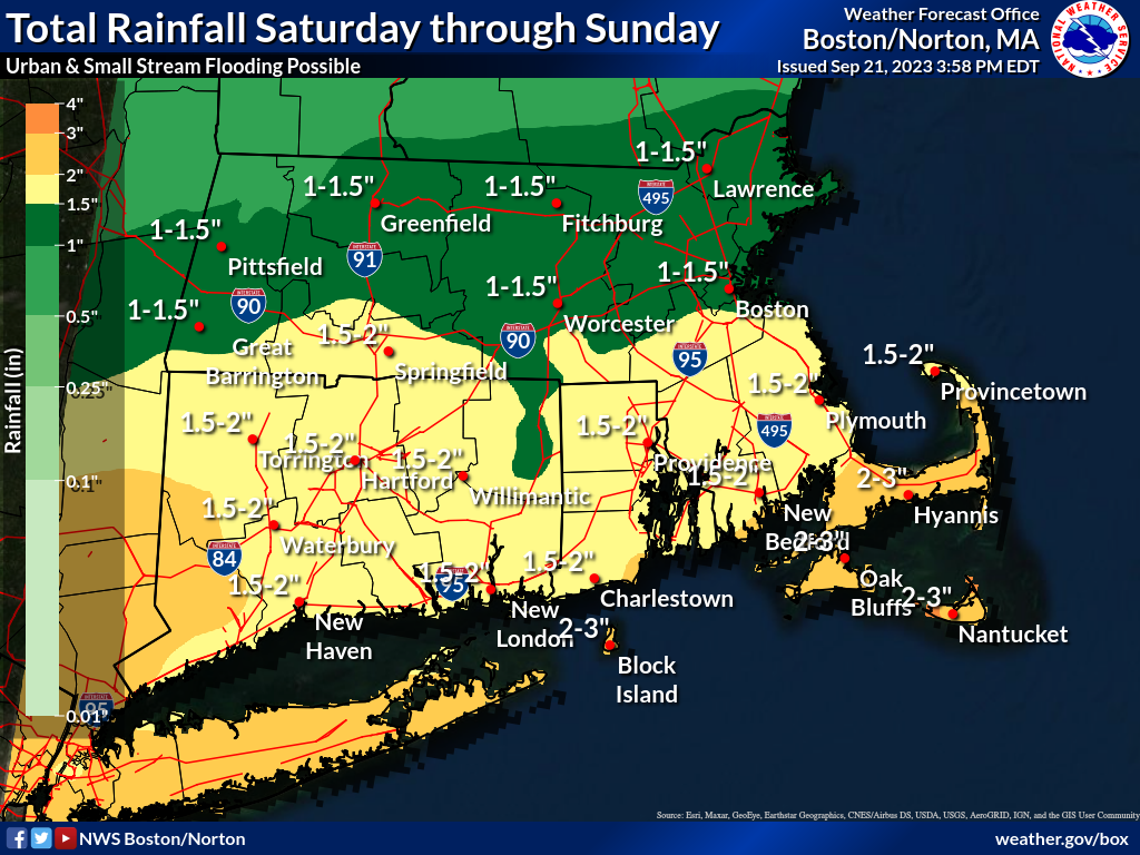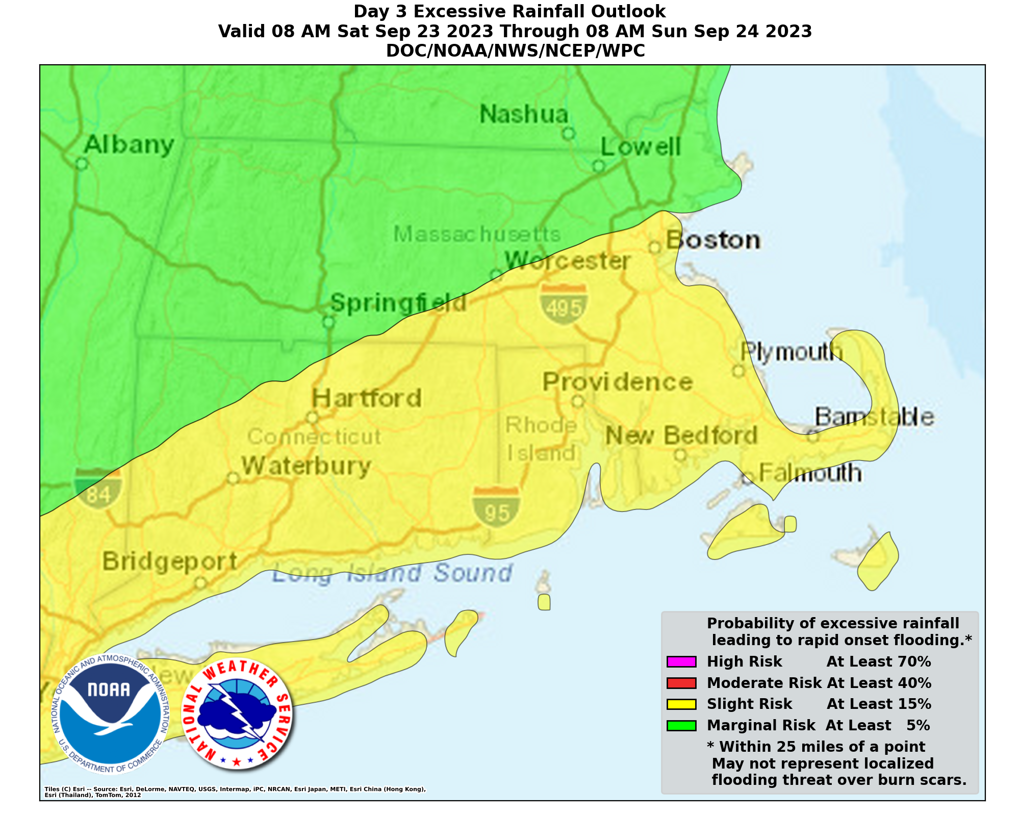 Good afternoon, An area of low pressure over the Carolina coast is forecast to move northward this weekend and then move offshore early next week. This system is forecast to bring a period of steady rain to Southern New England this weekend into early next week. The greatest impact from this weather system is from heavy rain. We do not anticipate the torrential kind of rain that was experienced in several heavy rain events this summer - but rather a long-duration, steady rain which adds up over time. Even so, as rain falls and adds up, instances of street flooding as well as rises on mainstem rivers and creeks are still possible. At this time, we expect rain to fall heavy at times on Saturday, with a lighter to moderate rain on Sunday and Monday. Exact rain amounts and how long rain may last are still uncertain and subject to further adjustments. We've attached a one-page briefing, the Excessive Rain Outlook from the Weather Prediction Center for Saturday, as well as our current best estimate for rain totals Saturday and Sunday. Expect the next update to this briefing to be sent by 6 AM Friday. Thank You! Meteorologists: Andrew Loconto and Bill Leatham If you have any questions or would like more information, please don't hesitate to contact us. You can reach us via: email: box.operations@noaa.gov phone: 508.622.3280 Slack/NWSChat 2.0 <https://nwschatws.slack.com/> (for approved partners) social media: Website <http://www.weather.gov/boston> | Facebook <http://www.facebook.com/NWSBoston> | Twitter <http://www.twitter.com/NWSBoston>