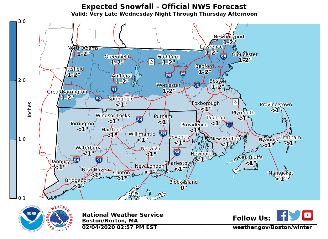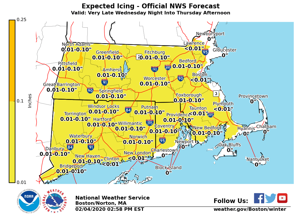 Good afternoon everyone, High confidence that a wintry mix that will impact the Thursday morning commute, but amounts will be light. A second stronger storm will impact the region Thursday night into Friday, but there is more uncertainty how we are impacted. Heavy rain and pockets of street flooding are possible across Rhode Island and Southeast MA. There is also a low probability for significant ice accretion across the interior high terrain of Massachusetts, but uncertainty is high given temperatures right near freezing. We have included a brief outline below and some graphics. Please note that the graphics only include the first event. *1) Late Wednesday Night Into Thursday Afternoon Event* *What/When/Where: * - Precipitation starts between 2 and 5 AM Thursday morning. Main precipitation type will initially be sleet and freezing rain, but a brief period of snow is possible at the onset with the best chance across northern MA. - The wintry mix should change to rain along and southeast of the Boston to Providence corridor by late Thursday morning. Sleet and freezing rain will linger into the afternoon across parts of interior MA & CT, but begin to taper off. - Most locations should have ended as light rain or drizzle by late Thursday afternoon, but a few pockets of lingering freezing drizzle can not be ruled out across the high terrain of the Berkshires and northern Worcester Hills. *Potential Snow/Ice Accumulations: * - Snow and sleet accumulations of a coating to 2 inches are expected. The best chance of seeing an inch or two of snow and sleet will be north of the Massachusetts Turnpike. - Ice accretion on the order of a few hundredths to one tenth of an inch are expected for much of southern New England *Impacts/Uncertainty: * - High confidence that the wintry mix will coincide with the Thursday morning rush hour, despite relatively light amounts of snow and ice. - The biggest uncertainty is whether or not we initially see a few inches of snow in northern MA or mainly just sleet and freezing rain. Either way, the Thursday morning rush hour will be impacted. - Confident that most of the region will be above freezing by late Thursday afternoon, except perhaps the highest terrain of the Berkshires and northern Worcester Hills. *2) Thursday night and Friday Event:* *Potential Impacts / Uncertainty:* *- *This will be a much stronger storm than the first event, but more uncertainty in regards to how we are impacted. - 1 to 3 inches of rain is possible which may result in some street flooding especially across Rhode Island and Southeast Massachusetts. Heaviest rain late Thursday night into early Friday morning. - Temperatures might be marginally cold enough for freezing rain / icing across portions of interior Massachusetts. Low probability for 0.25 to 0.50 half inch of ice accretion in parts of the Berkshires and northern Worcester Hills. - Rain may change to snow Friday afternoon and early evening with a few inches of accumulation possible. Highest risk for that is across northern Massachusetts. *- Biggest concern is the potential for ice accretion to reach one half inch across parts of the Berkshires and Worcester Hills. While a low probability, this would bring the potential for scattered power outages.* Thank You Meteorologist: Hayden Frank and Rodney Chai If you have any questions or would like more information, don't hesitate to contact us via this email address, on NWSChat <https://nwschat.weather.gov/>, or at the following: National Weather Service Boston/Norton, MA 46 Commerce Way Norton, MA 02766 508.622.3280 Website <http://www.weather.gov/boston> | Facebook <http://www.facebook.com/NWSBoston> | Twitter