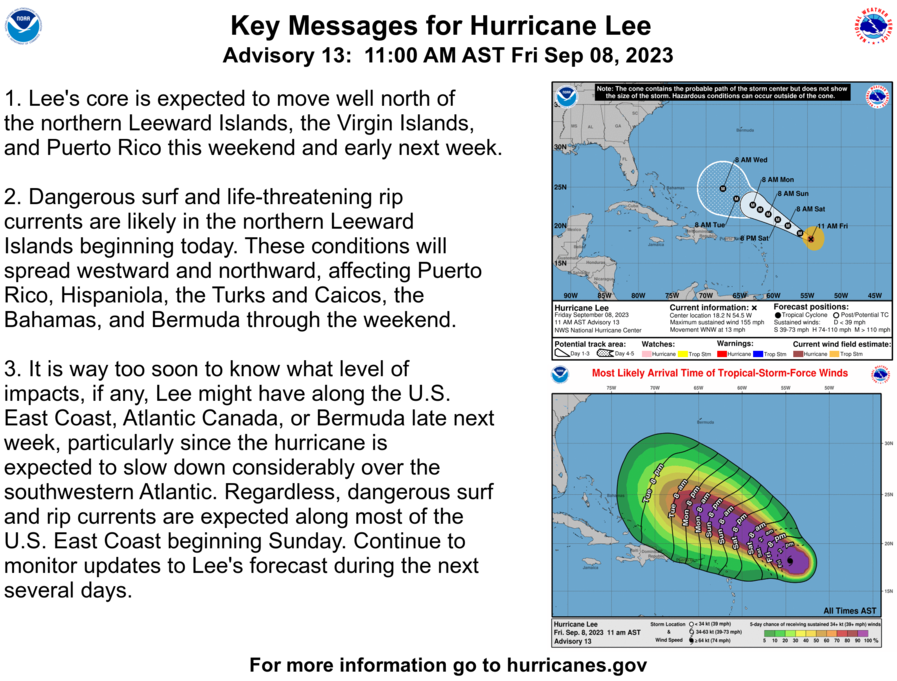 All, We are closely monitoring the forecasts of Hurricane Lee, just as you are. As a reminder, the official NWS forecasts for Lee are available at: https://www.nhc.noaa.gov/#Lee The forecasters at the National Hurricane Center update the forecasts every 6 hours -- 5am, 11am, 5pm and 11pm. At this time, it is far too soon to accurately predict what kind of impacts that could occur in our area. We strongly encourage you to follow the forecasts, and keep up with the "Key Messages" that are updated with each new forecast and available via the NHC link above. I have attached the current Key Messages to this email. The one more certain aspect of the forecast is that large ocean swells will begin reaching our coastline early next week. That will result in heavy/rough surf, rip currents and perhaps spots of coastal erosion. We will start up email briefings twice daily if our area starts to fall under the "cone of forecast uncertainty", which could be early next week. This email is just to help raise awareness as we go into the weekend. Have a good weekend! Andy Nash If you have any questions or would like more information, please don't hesitate to contact us. You can reach us via: email: box.operations@noaa.gov phone: 508.622.3280 Slack/NWSChat 2.0 <https://nwschatws.slack.com/> (for approved partners) social media: Website <http://www.weather.gov/boston> | Facebook <http://www.facebook.com/NWSBoston> | Twitter <http://www.twitter.com/NWSBoston>