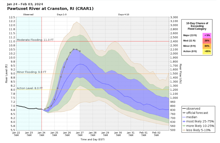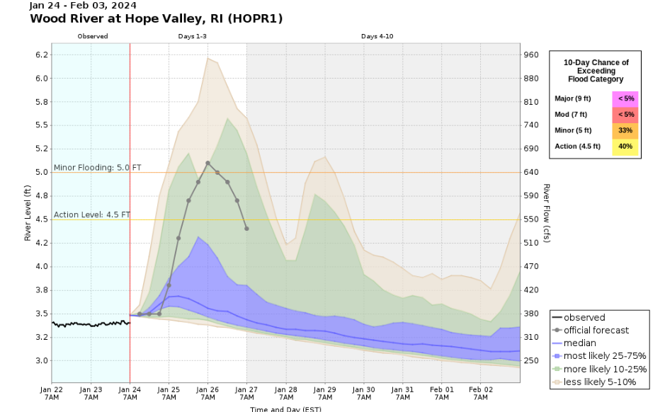 Good afternoon all, Here is an updated briefing on potential river flooding in Rhode Island. There have been no significant changes to the forecast. A Flood Watch continues for Rhode Island (except Block Island) Thursday night into Friday. We are mainly concerned about the possibility of the Pawtuxet River reaching its moderate flood stage sometime Friday into Saturday. The Wood River may also crest in minor flood early Friday. Note that we *do not* expect flooding to be as significant as it was earlier this month. Homes and businesses could be impacted in low lying sections of Warwick, West Warwick and Cranston. In addition to the one page briefing, we have attached river level probabilities for the Pawtuxet River and Wood River. Thanks. Kevin Cadima and Andrew Loconto If you have any questions or would like more information, please don't hesitate to contact us. You can reach us via: email: box.operations@noaa.gov phone: 508.622.3280 Slack/NWSChat 2.0 <https://nwschatws.slack.com/> (for approved partners) social media: Website <http://www.weather.gov/boston> | Facebook <http://www.facebook.com/NWSBoston> | Twitter <http://www.twitter.com/NWSBoston>