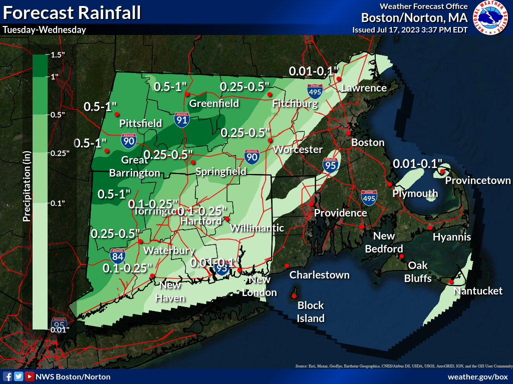 Good afternoon everyone, Attached is a one-pager briefing which provides information on the localized flash flood threat across parts of interior southern New England Tuesday afternoon and evening. There is also a low chance of severe thunderstorms across the interior, with localized wind damage and hail being the main hazards. We have also attached a larger version of the Flood Watch graphic as well as the latest rainfall forecast. If you have any questions or would like more information, don't hesitate to contact us via this email address, on NWSChat <https://nwschat.weather.gov/>, or at 508.622.3280. Thanks, Joe Dellicarpini NWS Boston/Norton