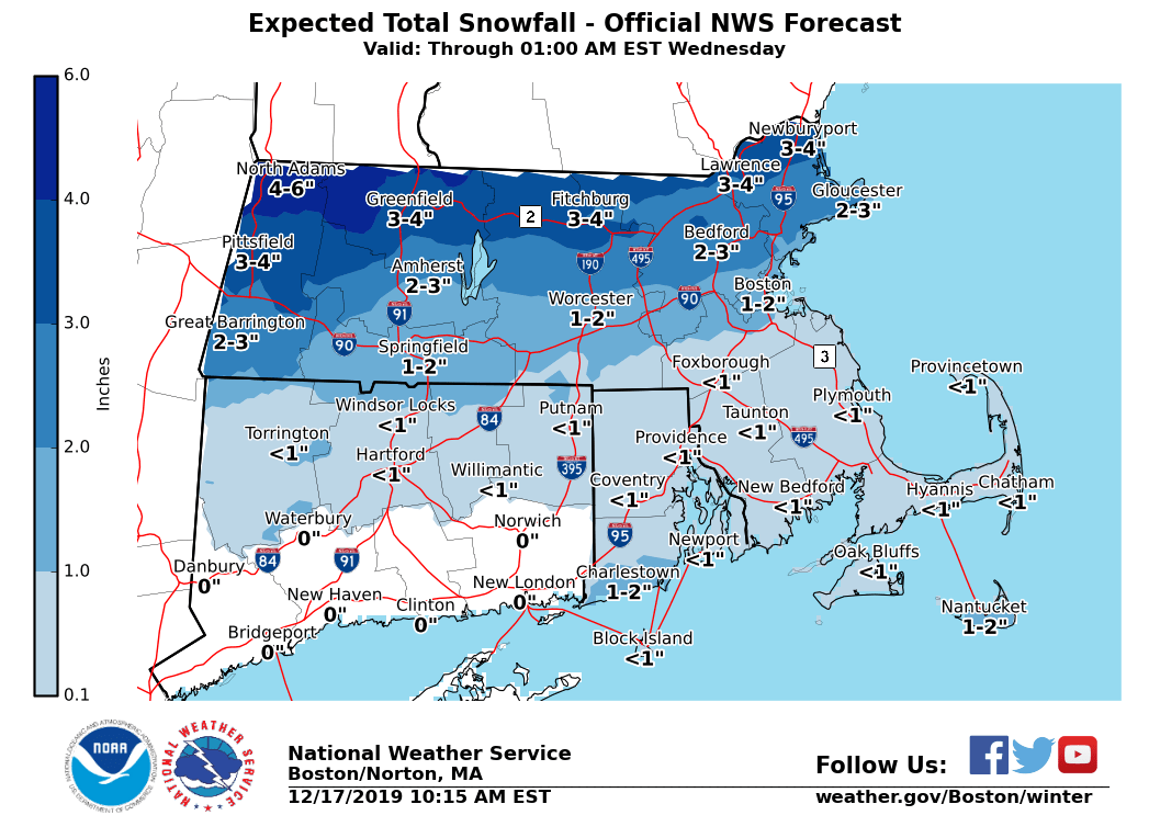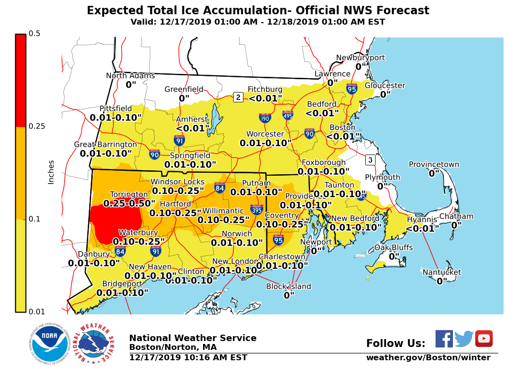 Good morning everyone: Based on observations this morning, we are reducing expected snowfall accumulations across most of southern New England. At the same time, we are increasing the expected ice accumulations south of the Mass Pike into northern CT and northern RI. The latest maps are attached. Matthew Belk If you have any questions or would like more information, don't hesitate to contact us via this email address, on NWSChat <https://nwschat.weather.gov/>, or at the following: National Weather Service Boston/Norton, MA 46 Commerce Way Norton, MA 02766 508.622.3280 Website <http://www.weather.gov/boston> | Facebook <http://www.facebook.com/NWSBoston> | Twitter <http://www.twitter.com/NWSBoston>