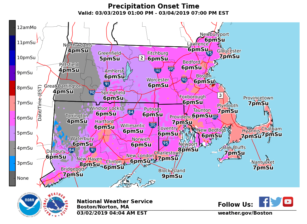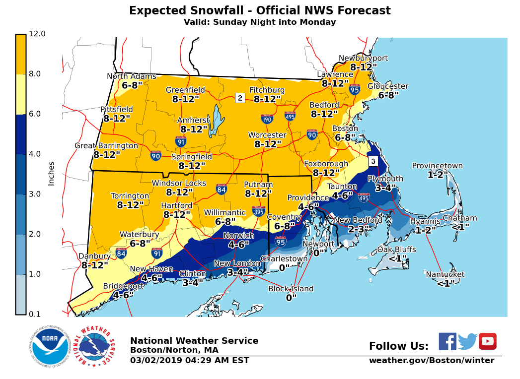 Good morning. Attached is our briefing package on the current wet snow event for Today. We have issued a Winter Storm Watch for the Sunday evening to Monday morning storm; we have also included graphics for our snowfall forecast and "Onset" graphic for that storm. Lastly, please stay tuned for additional emails and another possible conference call sometime later today. *Today:* What: - Wet Snow with accumulations of 2 to 6 inches across most of the region with 4 to 8 inches across Southeast MA. Lower amounts forecast on Cape Cod where some rain and sleet may be mixed in at times. Where: - All of southern New England with the heaviest snow expected across southeast MA into Rhode Island. When: - Snow develops from south to north this morning. Heaviest snow expected from 7 AM through 1 PM with 1 inch per hour snowfall rates across RI and SE MA. Lighter snowfall continues this afternoon. *Potential Impacts/Uncertainty: * *- *High confidence in a plowable snowfall for much of the region. - Main uncertainty is if higher snowfall amounts are realized, increasing the risk for isolated to scattered power outages. Greatest risk for this is across southeast MA and RI. - Lower confidence in snowfall amounts across the Cape and Islands with snow potentially mixing with rain and sleet. *Sunday Evening Into Mid Morning Monday:* *Changes:* - A Winter Storm Watch has been issued for all except coastal areas. *What:* - Accumulation of 6 to 12 inches possible north and west of the Boston-Providence corridor. Lesser amounts to the south and east. - Impacts to the Monday morning commute especially across the interior. - Risk for isolated to scattered power outages from northern CT into northwest RI and interior MA if higher snow amounts are realized. *Where:* - Greatest risk for significant snow will be northwest of the Boston to Providence corridor, but significant snow is still possible in the Boston to Providence corridor depending on the exact track. *When:* - Snow develops between 5 and 8 pm Sunday evening and will be heavy at times during the overnight hours. - Snow may change to rain across portions of coastal and southeastern MA and RI depending on the exact track. - Precipitation tapers off by mid morning Monday *Uncertainty:* - Forecast models have moved closer to each other and favor a storm passing off the coast. There remains some uncertainty on placement of the rain-snow line as the forecast tracks shift, but less uncertainty than in previous forecasts. - Forecast confidence should further increase this afternoon and tonight. Please let us know if you have any questions or concerns. We have briefing package update by 6 pm this evening. Thank You Attachments: Winter Storm Briefing for Today Onset Chart of Sunday night storm Expected Snowfall of Sunday night storm If you have any questions or would like more information, don't hesitate to contact us via this email address, on NWSChat <https://nwschat.weather.gov/>, or at the following: National Weather Service Boston/Norton, MA 46 Commerce Way Norton, MA 02766 508.622.3280 Website <http://www.weather.gov/boston> | Facebook <http://www.facebook.com/NWSBoston> | Twitter <http://www.twitter.com/NWSBoston>