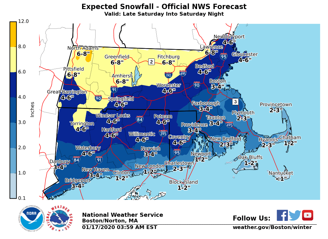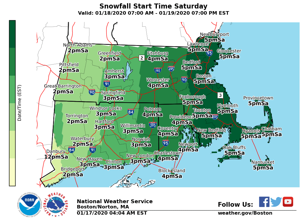 Good morning everyone, A Winter Storm Watch has been issued to the northwest of the Boston to Providence corridor late Saturday and Saturday night. This includes western, central and northeast MA, as well as northern CT and northwest RI. A Winter Weather Advisory has been issued for southern Connecticut Saturday into Saturday night. We will include a brief outline of our expectations in this email. Also, the approximate arrival time of the snow on Saturday along with the current Winter Weather Headlines and expected snowfall amounts will also be attached. *WHAT/WHERE/WHEN:* *- *Winter Storm Watch Issued for western/central and northeast MA, as well as northern CT and northwest RI late Sat into Sat night. - Winter Weather Advisory Issued for southern CT Saturday into Saturday night. - Snow overspreads southern New England from west to east between 2 and 5 PM Saturday. - Bulk of the accumulating snow occurs late Saturday through Saturday evening. - Potential exists for 4 to 7 inches of snow in the Winter Storm Watch area, generally northwest of the Boston to Providence corridor. Up to 8 inches are possible across portions of the Berkshires. - Along and southeast of the Boston to Providence corridor, 2 to 4 inches of snow are expected. This also includes southern CT, where a Winter Weather Advisory has been issued. *IMPACTS:* *- *Snow develops between 2 and 5 PM Saturday from west to east and sticks immediately on roadways with temps well below freezing. This includes the Boston to Providence corridor. - Bulk of accumulating snow occurs late Saturday into Saturday evening, when 1 inch per hour snowfall rates are possible. - Untreated roads will be snow-covered and slippery Saturday evening along with poor visibility at times. - Bulk of accumulating snow ends after midnight, but lighter snow/freezing drizzle may persist across the interior. Snow probably ends as light rain/drizzle along and southeast of the Boston to Providence corridor after midnight. - Temperatures rise above freezing Sunday morning in all locations. *CONFIDENCE:* *- *High confidence in a plowable snow across the region late Saturday into Saturday night including the Boston to Providence corridor. - High confidence that the bulk of the accumulating snow occurs late Saturday into Saturday evening. - While we have high confidence in accumulating snow across the region, specific amounts remain uncertain. - We currently expect 4 to 7 inches of snow northwest of the Boston to Providence corridor with 2 to 4 inches along and southeast of the Boston to Providence corridor. - If the storm ends up weaker/milder, snowfall totals would be in the 2 to 4 inch range in most locations. If the storm ends up a bit stronger, some 5 to 6 inch amounts would be possible further southeast onto the Boston to Providence corridor. Please let us know if you have any questions or concerns. An updated to this email will be sent by late afternoon. Thank You Meteorologist: Hayden Frank If you have any questions or would like more information, don't hesitate to contact us via this email address, on NWSChat <https://nwschat.weather.gov/>, or at the following: National Weather Service Boston/Norton, MA 46 Commerce Way Norton, MA 02766 508.622.3280 Website <http://www.weather.gov/boston> | Facebook <http://www.facebook.com/NWSBoston> | Twitter <http://www.twitter.com/NWSBoston>