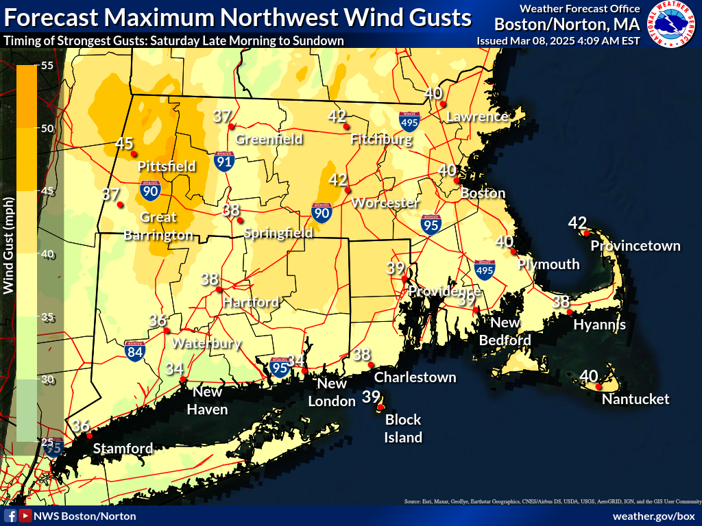 Good morning, Following is a short decision support briefing for Saturday, with another round of gusty to locally strong west wind gusts expected later today in Southern New England. Following the passage of a cold front later this morning, northwest winds will again become gusty, topping out in most areas around 35 to 45 mph. Adverse impact from this level of gusts should be minimal. There are no active wind headlines in effect for Connecticut, Rhode Island and most of Massachusetts. However wind gusts up to 50 mph are expected in the Berkshires. With the strong wind event that occurred yesterday that may have weakened trees and limbs, gusts to that level could cause additional wind damage. A *Wind Advisory* has been posted for the Berkshires, which runs through 10 PM this evening. Attached graphics include the forecast maximum wind gusts across Southern New England and the current wind headlines in effect. *Next Briefing:* By 600 PM Saturday, or sooner if conditions warrant. Thank You! Meteorologist: Andrew Loconto If you have any questions or would like more information, please don't hesitate to contact us. You can reach us via: email: box.operations@noaa.gov phone: 508.622.3280 Slack/NWSChat 2.0 <https://nwschatws.slack.com/> (for approved partners) social media: Website <http://www.weather.gov/boston> | Facebook <http://www.facebook.com/NWSBoston> | Twitter <http://www.twitter.com/NWSBoston>