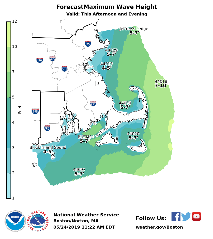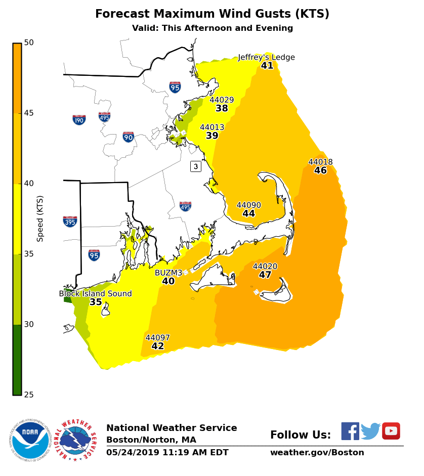 Good Morning Everyone, We have increased the forecast wind gusts for this afternoon and this evening near the coast. As a result, the following changes have been made: - *Wind Advisory* expanded to include coastal Plymouth County and Martha's Vineyard. - *Storm Warning* issued for Nantucket Sound and the outer coastal waters from Provincetown to Nantucket and Martha's Vineyard. Confidence remains high that a wind shift to the northeast will occur between 1 PM and 5 PM, accompanied by a burst of strong winds and a temperature drop into the 50s over the coastal waters and from coastal Plymouth County to Cape Cod and the Islands. *Since this is the start of the holiday weekend, many recreational boaters may be caught off guard by the sudden increase in wind gusts and rapidly building seas.* Here are the details: *Coastal Plymouth County, Cape Cod, Martha's Vineyard, and Nantucket:* - A Wind Advisory is in effect until 9 PM. - Wind gusts of up to 50 mph expected, especially between 3 and 7 PM. - Minor wind damage, such as a few downed branches, may occur. *Coastal Waters:* - Storm Warnings issued for Nantucket Sound and the outer coastal waters from Provincetown to Nantucket and Martha's Vineyard. Gusts of 45 to 50 knots are expected, especially between 3 and 7 PM. Gusts will fall below Gale Force after 9 PM. - Gale Warnings remain posted for most of the Massachusetts and Rhode island coastal waters through early tonight. Wind gusts of up to 40 knots are expected. - A rapid wind shift to the northeast and burst of strong wind gusts will first occur around 1 PM off Cape Ann and will reach the waters adjacent to Cape Cod and the Islands between 3 PM and 5 PM. Graphics showing the latest forecasts of maximum wind gusts and maximum wave heights are attached. If you have any questions or would like more information, don't hesitate to contact us via this email address, on NWSChat <https://nwschat.weather.gov/>, or by phone at 508.622.3280. Thanks, Joe DelliCarpini and Hayden Frank