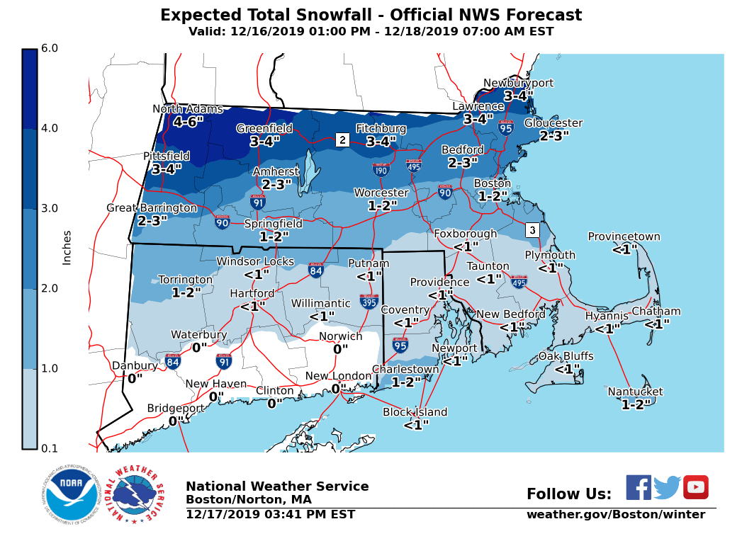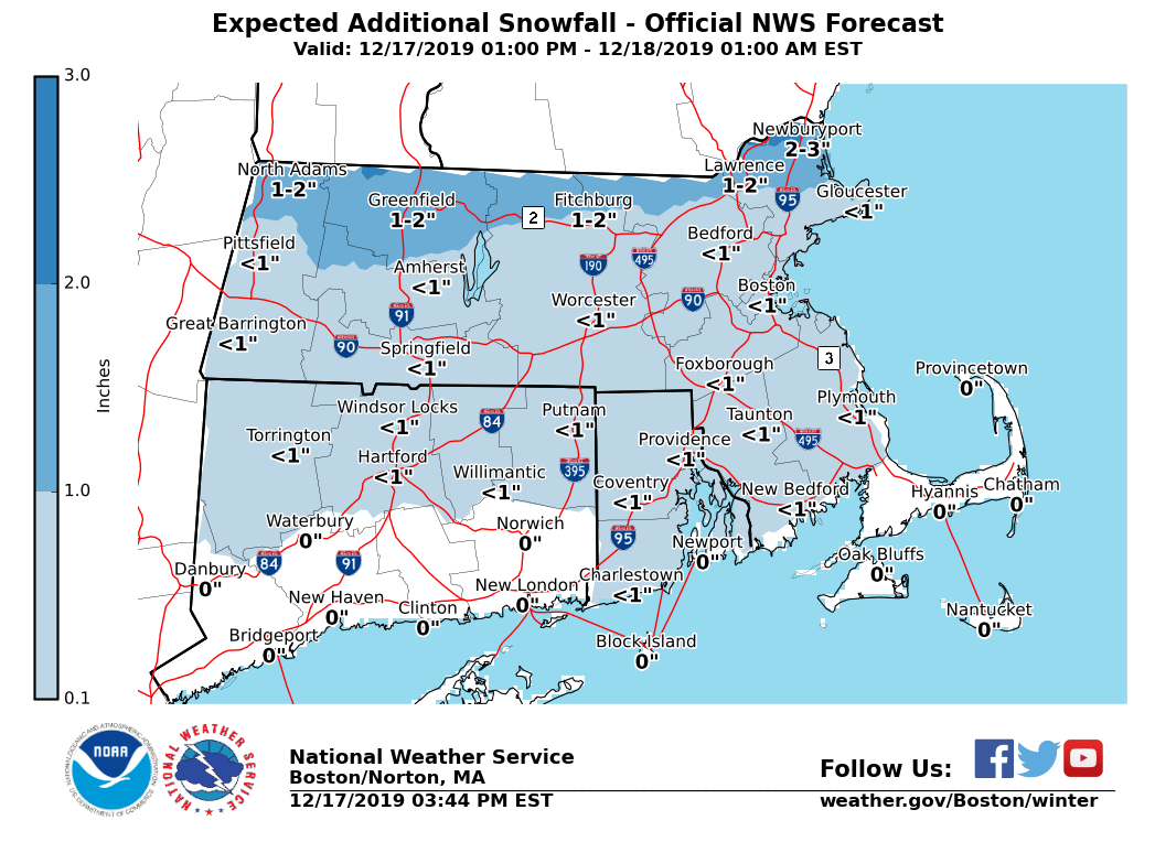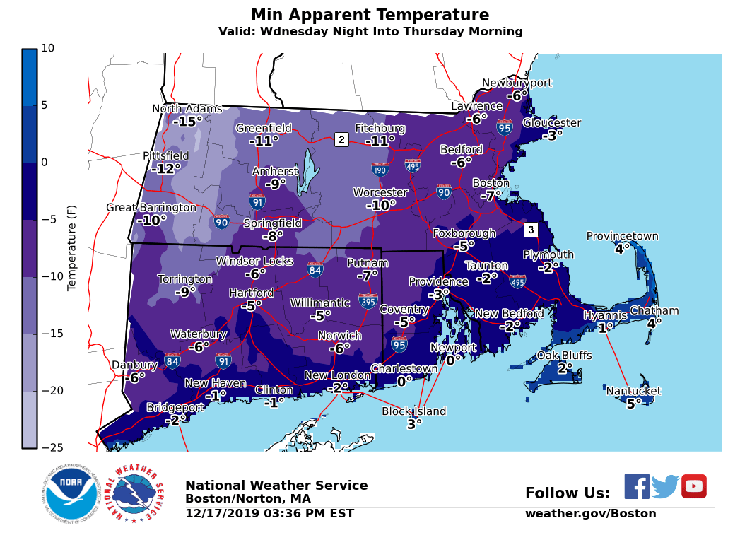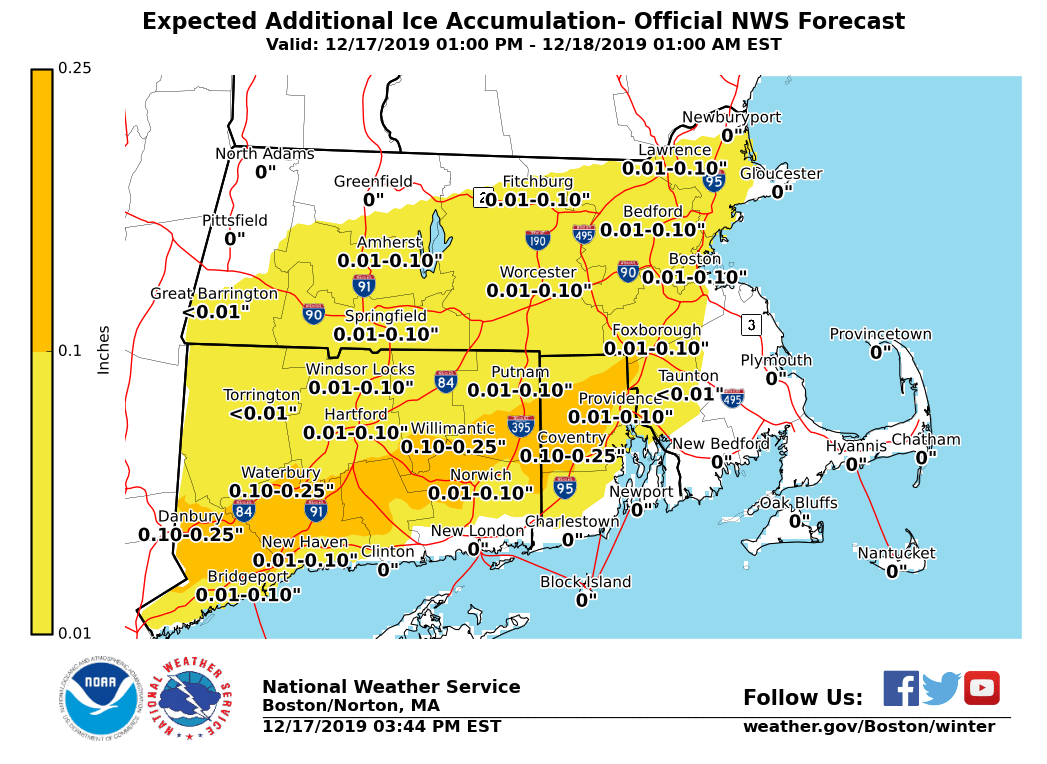 Good afternoon everyone, Here is the latest briefing for this evening, possible snow squalls Wednesday afternoon and evening, as well as the arctic blast Wednesday night into Thursday. *What Has Changed:* - Winter Weather Advisories extended until 9 PM this evening *Additional A**ccumulating Snow and Light To Moderate Ice Accretion:* *Locations*: South of Route 2 in northern MA. *Timin*g: Mixed precipitation. *Amounts*: Up to 1 inch of additional snow accumulation, with up to one tenth inch of additional ice accretion. Icing most likely across northern CT, northern RI and southern MA into Metrowest. *Impact*: Snow and ice will result in hazardous travel for the evening commute. Untreated surfaces will be slippery. *Confidence*: High confidence in mixed precipitation. Moderate confidence in timing for individual precipitation types at any given location. *Locations*: North of Route 2 in northern MA. *Timin*g: Mainly snow, with periods of sleet and freezing rain at times. Rain towards the immediate east coast of MA. *Amounts*: 1 to 2 inches of additional snow/sleet. A trace to less than one tenth inch of additional ice accretion, mainly near the Mass Pike and Middlesex County. *Impact*: Snow and ice will result in hazardous travel for the evening commute. Untreated surfaces will be slippery. *Confidence*: High confidence in mixed precipitation. Moderate confidence in timing for individual precipitation types at any given location. *Isolated to Scattered Snow Squalls:* *Locations*: All locations. *Timing*: Wednesday afternoon into early evening. *Amounts*: A quick coating to half an inch in less than 30 minutes. *Impact*: Temporarily reduced visibility could catch drivers off guard, especially for early evening commute. Also, roads could become snow-covered quickly, resulting in slippery travel. *Confidence*: Low to moderate. Areal extent of snow squalls will be limited with many locations likely remaining dry. Best chance of snow squalls will be in the interior. *Bitter Cold/Very Low Wind Chills:* *Locations*: All locations. *Timing*: Wednesday night into Thursday morning. *Amounts*: Wind chill values -5 to -20°F across the interior, and zero to -5°F across eastern MA and RI. *Impact*: Coldest air of the season. Bitter cold wind chills for school bus stops. *Confidence*: High. Wind Chill Advisories may be issued with later forecasts. *Potential risk of freezing spray:* *Locations*: Immediate coastal waters off Eastern MA and RI. *Timing*: Wednesday night into early Thursday morning. *Amounts*: Light to moderate freezing spray possible. *Impact*: Glaze of ice possible on boats and ships traversing the waters. *Confidence*: Moderate overall, highest risk across the nearshore waters. Matthew Belk If you have any questions or would like more information, don't hesitate to contact us via this email address, on NWSChat <https://nwschat.weather.gov/>, or at the following: National Weather Service Boston/Norton, MA 46 Commerce Way Norton, MA 02766 508.622.3280 Website <http://www.weather.gov/boston> | Facebook <http://www.facebook.com/NWSBoston> | Twitter <http://www.twitter.com/NWSBoston>