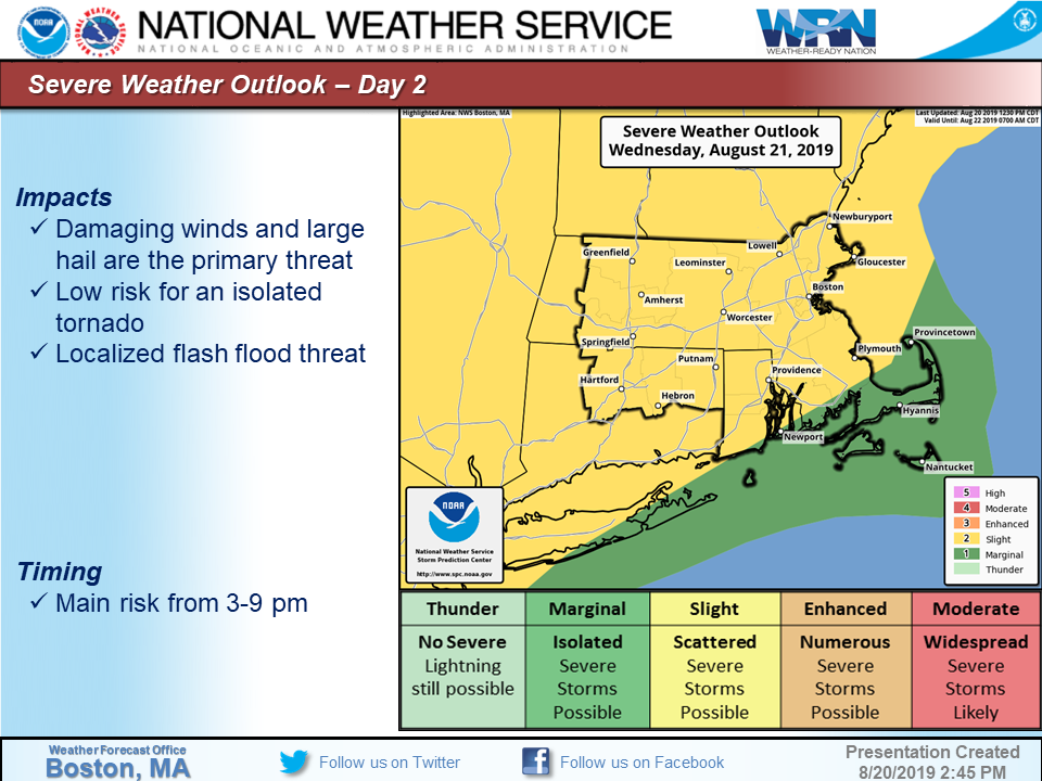 Good afternoon, Just wanted to send you a heads up on the potential for severe weather Wednesday afternoon and evening across southern New England. Details follow below. *WHAT/WHEN:* - Scattered strong to severe thunderstorms with the main risk from 3 to 9 pm. *WHERE:* - All of southern New England is at risk, but the greatest risk is north and west of the Boston to Providence corridor. *POTENTIAL IMPACTS:* - Damaging wind gusts and large hail are the primary threat - Low risk for an isolated tornado - Torrential downpours with any strong storms will result in a localized flash flood threat - Dangerous cloud to ground lightning will pose a risk to those with outdoor activities, including mariners and beach goers. *UNCERTAINTY:* - A few showers or thunderstorms may move through the region late tonight into Wed morning. If clouds and showers linger longer than expected, the severe weather risk in the afternoon would be lower. If clearing develops fast enough, the severe weather risk would increase. If you have any questions or would like more information, don't hesitate to contact us via this email address, on NWSChat <https://nwschat.weather.gov/>, or at the following: National Weather Service Boston/Norton, MA 46 Commerce Way Norton, MA 02766 508.622.3280 Website <http://www.weather.gov/boston> | Facebook <http://www.facebook.com/NWSBoston> | Twitter <http://www.twitter.com/NWSBoston>