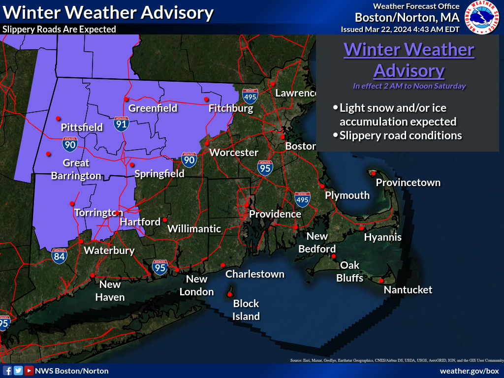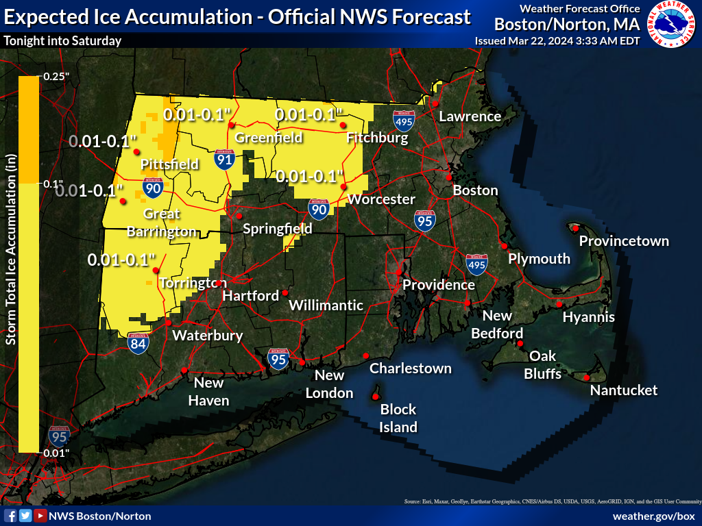 Good morning, Here is the updated briefing for the storm which will be impacting the region late tonight into Saturday night. Heavy rainfall of 2 to 3 inches with locally higher amounts will bring the potential for urban and poor drainage flooding as well as some river flooding, especially Saturday afternoon and night. Latest forecast information suggests the axis of heaviest rain will set up south of the MA Pike, especially across CT and RI. The greatest risk for river flooding is in Rhode Island, particularly the Pawtuxet and Wood River basins. In addition, a period of wintry precipitation on the front end late tonight will bring minor snow and/or ice accumulation for interior MA into portions of NW CT. A Flood Watch has been issued for areas along and south of the MA Pike, including CT, RI and eastern MA. A Winter Weather Advisory has been issued for central/W MA into NW CT for the combination of light snow and/or light ice accumulation. In addition to the one pager briefing, we have attached various graphics for snow and ice accumulation, expected rainfall amounts and flood watch and winter weather advisory areas. Thanks. Kevin Cadima and Torry Dooley If you have any questions or would like more information, please don't hesitate to contact us. You can reach us via: email: box.operations@noaa.gov phone: 508.622.3280 Slack/NWSChat 2.0 <https://nwschatws.slack.com/> (for approved partners) social media: Website <http://www.weather.gov/boston> | Facebook <http://www.facebook.com/NWSBoston> | Twitter <http://www.twitter.com/NWSBoston>