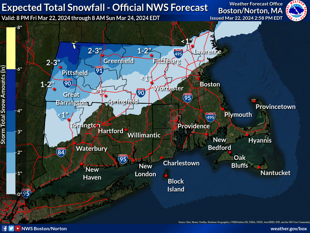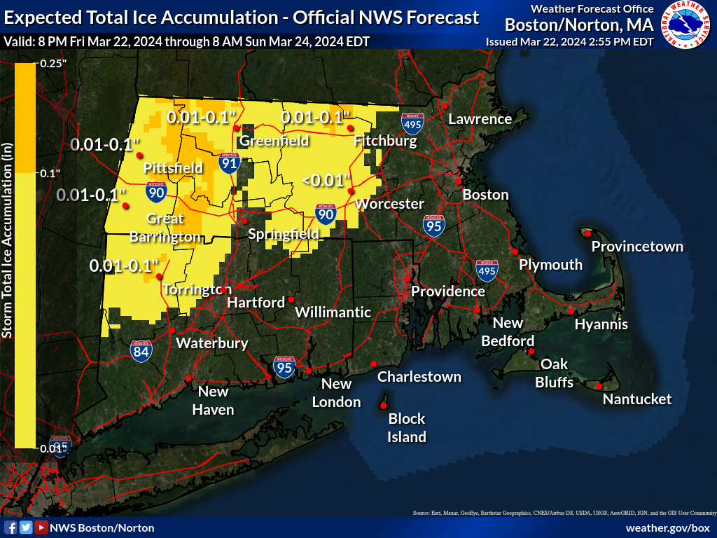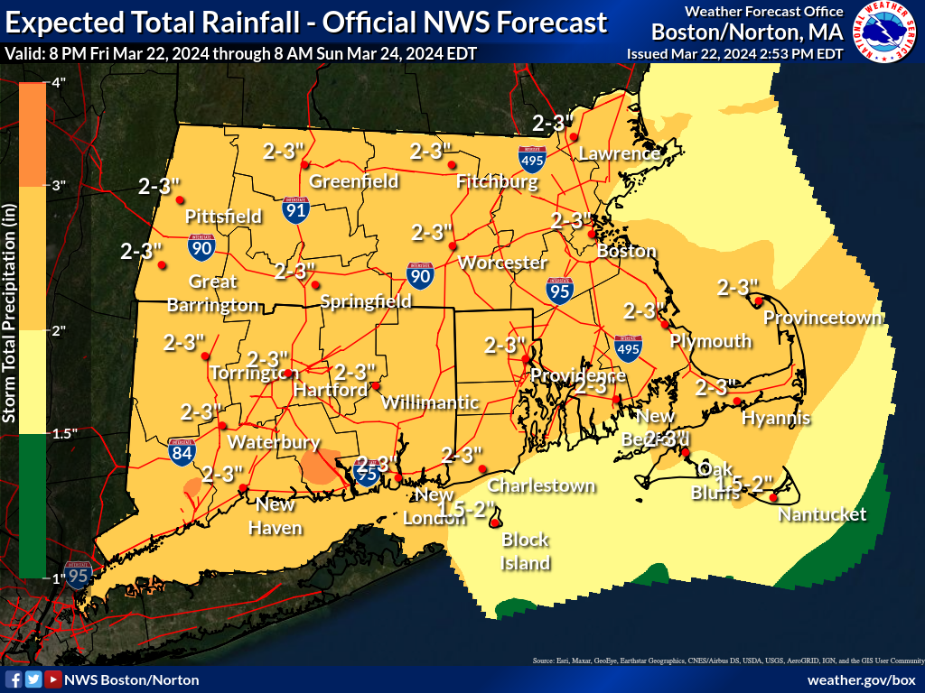 Good afternoon, Attached is our latest briefing regarding the upcoming storm tonight into Saturday night. Confidence is increasing for an impactful storm, mainly from the rainfall and subsequent flooding. Ice accumulations have also gone up slightly across central and western MA into portions of northern CT. We are still trying to pinpoint the exact location of the heaviest rainfall, but it will most likely be across eastern CT, RI and portions of southeast MA. The heaviest rainfall should still be some time Saturday afternoon into Saturday evening. Concerns continue for river flooding, especially the Wood, Pawcatuck and Pawtuxet Rivers in RI. We will also need to monitor the Taunton River in southeast MA closely. No changes to ongoing weather hazard headlines at this time. We will send that graphic shortly. Rob Megnia and Matthew Belk If you have any questions or would like more information, please don't hesitate to contact us. You can reach us via: email: box.operations@noaa.gov phone: 508.622.3280 Slack/NWSChat 2.0 <https://nwschatws.slack.com/> (for approved partners) social media: Website <http://www.weather.gov/boston> | Facebook <http://www.facebook.com/NWSBoston> | Twitter <http://www.twitter.com/NWSBoston>