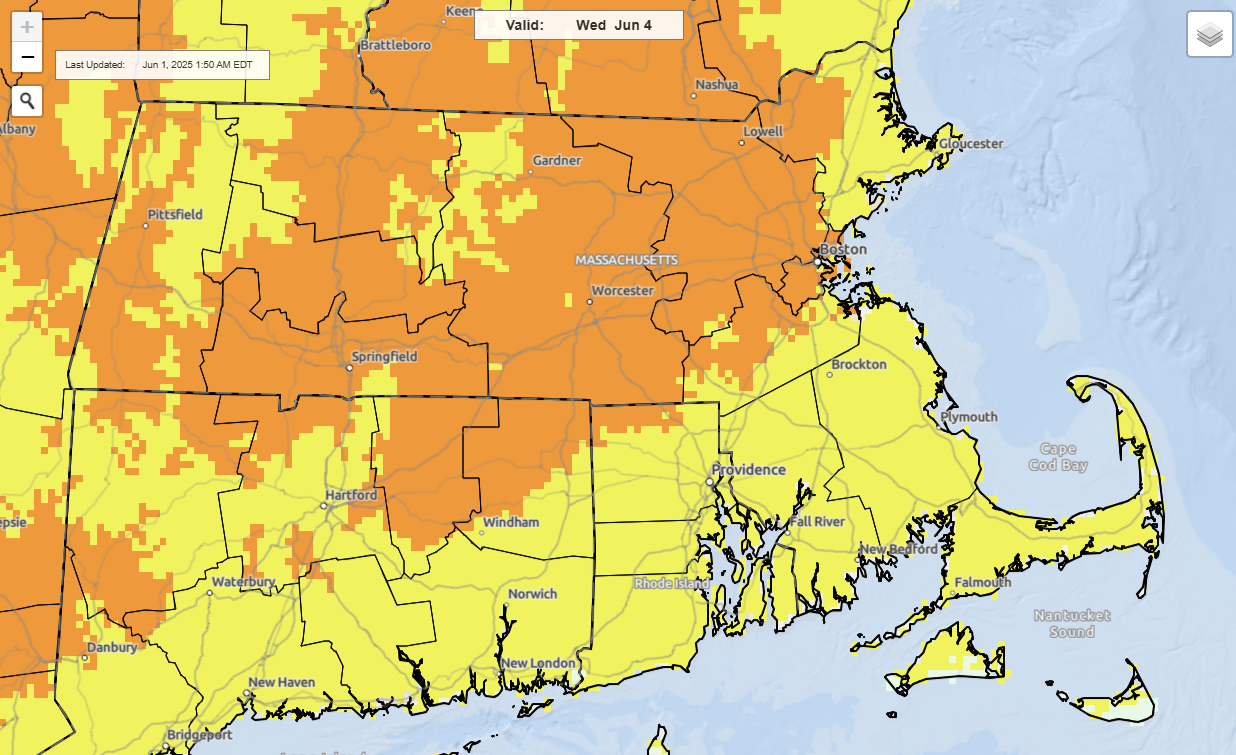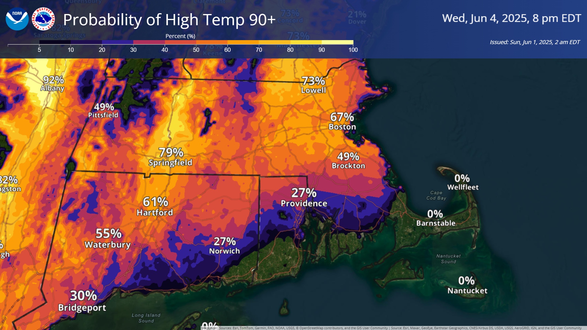 Good morning everyone, We wanted to give you an early heads up that we're monitoring some potential for an early season stretch of 90+F temperatures this coming Wednesday and Thursday. We also expect it to be rather humid, especially on Thursday when the peak of the heat is most likely. I've attached the Probability of seeing 90+ for both Wed and Thu, as well as the NWS Heat Risk <https://www.wpc.ncep.noaa.gov/heatrisk/> for each day. This index provides a forecast of the potential level of risk for heat-related impacts to occur over a 24-hour period and is indicating potential for *moderate impacts. *If you have any questions please don't hesitate to reach out. Thanks, Bryce Williams and Torry Dooley If you have any questions or would like more information, please don't hesitate to contact us. You can reach us via: email: box.operations@noaa.gov phone: 508.622.3280 Slack/NWSChat 2.0 <https://nwschatws.slack.com/> (for approved partners) social media: Website <http://www.weather.gov/boston> | Facebook <http://www.facebook.com/NWSBoston> | Twitter <http://www.twitter.com/NWSBoston>