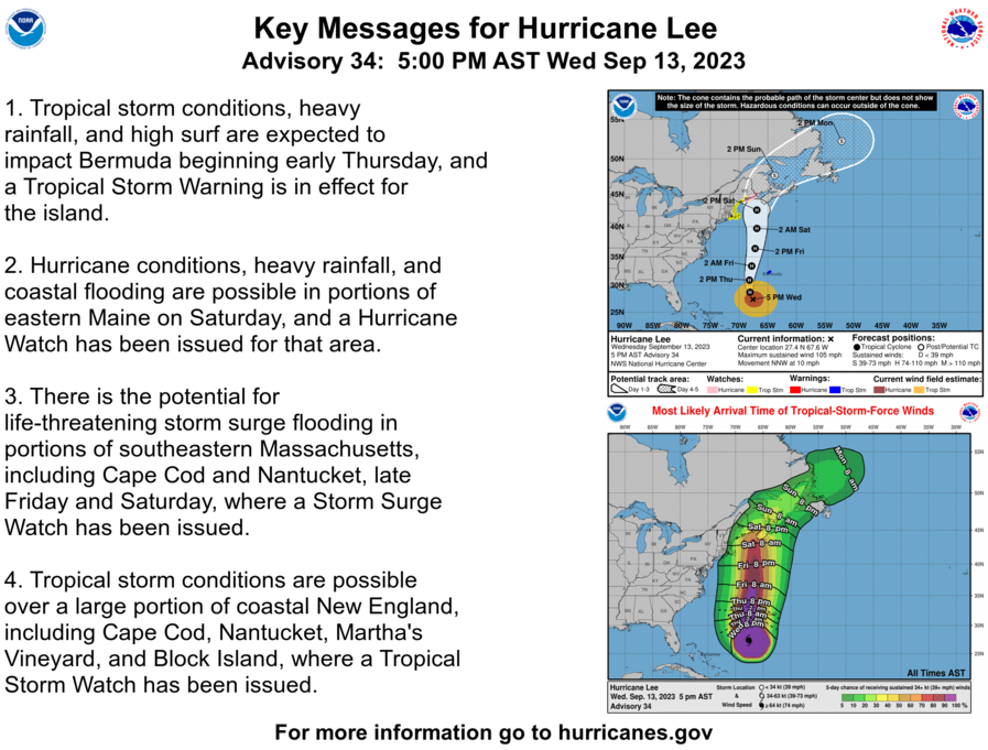 Good evening, Here is our latest briefing on Hurricane Lee from the 5 pm advisory from the National Hurricane Center. Tropical storm watches have been issued for the RI and MA coasts, and storm surge watches are in effect for Cape Cod and Nantucket. Thanks, Kevin Cadima, Matthew Belk and Bill Leatham If you have any questions or would like more information, please don't hesitate to contact us. You can reach us via: email: box.operations@noaa.gov phone: 508.622.3280 Slack/NWSChat 2.0 <https://nwschatws.slack.com/> (for approved partners) social media: Website <http://www.weather.gov/boston> | Facebook <http://www.facebook.com/NWSBoston> | Twitter <http://www.twitter.com/NWSBoston>