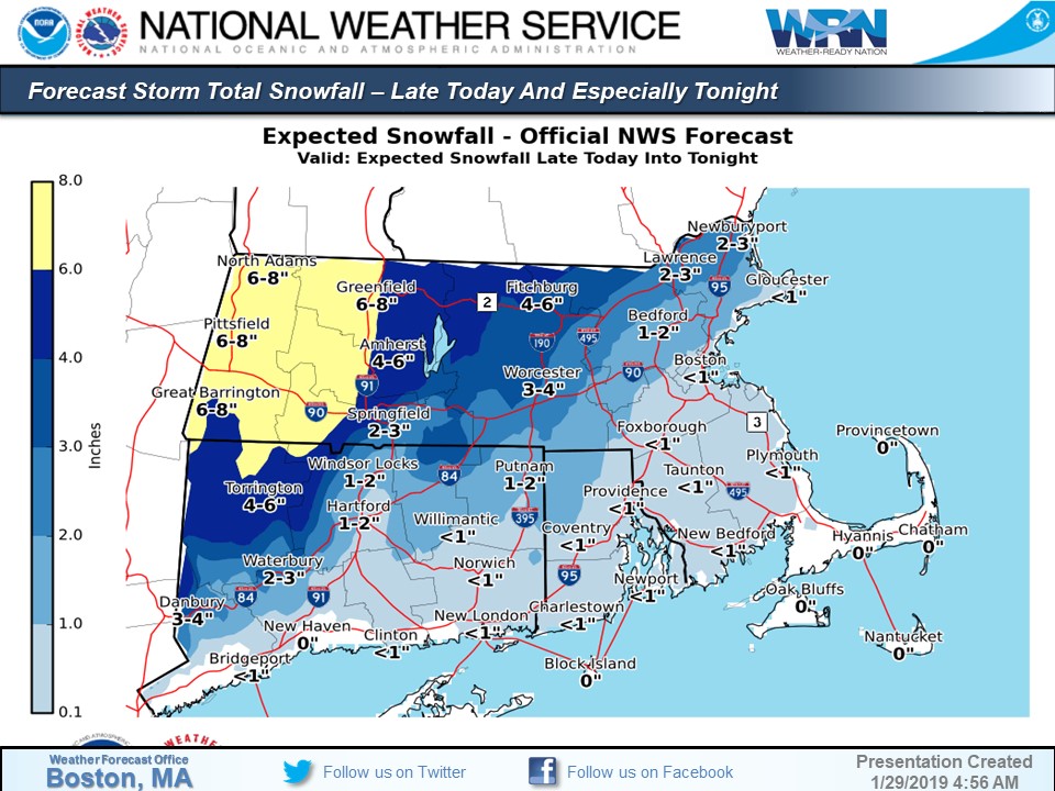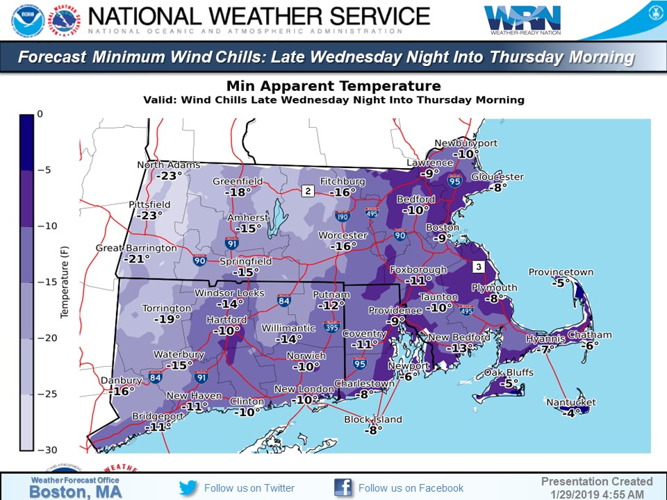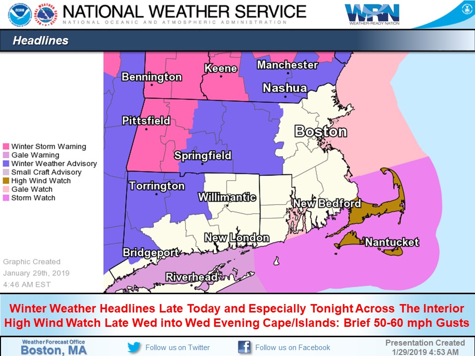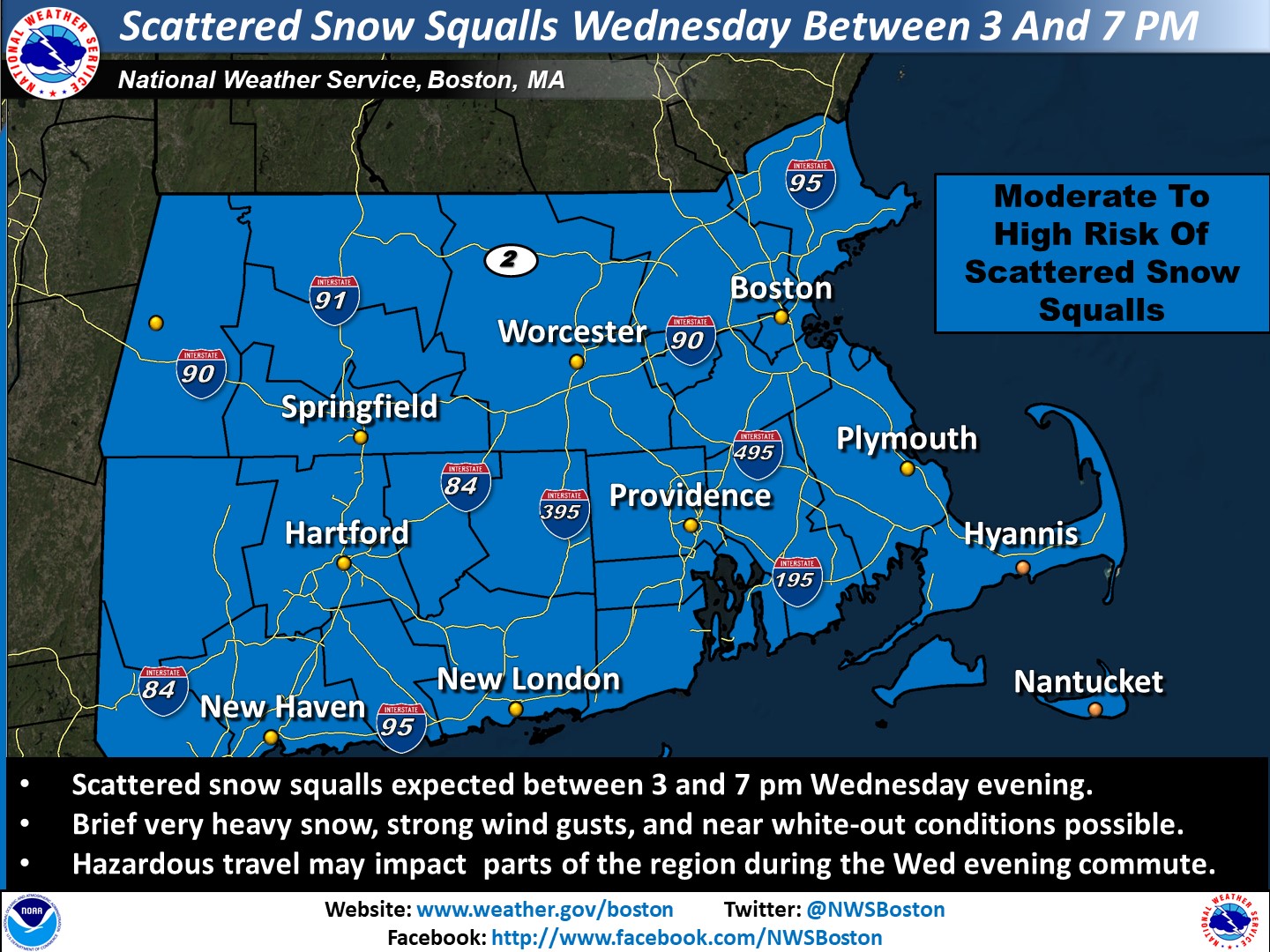 Good morning Here are the main weather concerns/impacts later today into Thursday morning. We have attached a few brief slides highlighting the main concerns. *Accumulating Snow late today into tonight: * - Precipitation overspreads western MA northern CT between 3 and 6 pm this evening, reaching eastern MA/RI after 6 or 7 pm. - Precipitation type mainly rain along and southeast of a Boston to Providence, to Hartford line after a brief period of snow possible at the onset. Any snow accumulations generally less than 1 inch. - Mainly snow expected northwest of a Bradley CT, to Worcester MA, to Bedford MA line. Snow accumulations of 2 to 5 inches anticipated, except 4 to 8 inches in the Berkshires. - Precipitation ends from west to east between 2 and 5 am Wednesday morning. Locations that change to rain may see precipitation end as a brief period of snow, mainly across northern CT and interior MA. - Dry weather anticipated for the Wednesday morning commute, but untreated roads across the interior may remain slippery. *Localized Snow Squalls/Brief Strong to Damaging Wind Gusts Wednesday Afternoon and Evening:* - Scattered snow squalls anticipated between 3 and 7 pm Wednesday evening. These squalls may contain briefly very heavy snow, strong winds, near white-out conditions, and hazardous travel for the Wed evening commute. - Brief 35 to 55 mph wind gusts possible Wednesday afternoon and evening in most locations and between 50 and 60 mph across the Cape/Islands. - High Wind Watch posted for the Cape and Islands. Wind Advisories may eventually be needed elsewhere. *Bitterly Cold Wind Chills Late Wednesday night into Thursday Morning:* - Wind chills drop to between 10 and 25 below zero late Wednesday night into Thursday morning. - Wind Chill Advisories will likely be needed for a good portion of the region with possible Wind Chill Warnings for portion of the higher terrain of Massachusetts. *Marine Headlines:* - Gale and Storm Watches hoisted for all waters Wednesday afternoon and evening for a period of 40 to 50 knot wind gusts. - Moderate to heavy freezing spray expected Wednesday night into Thursday night across the open waters Please let us know if you have any questions or concerns. Thank You Meteorologist: Hayden Frank If you have any questions or would like more information, don't hesitate to contact us via this email address, on NWSChat <https://nwschat.weather.gov/>, or at the following: National Weather Service Boston/Norton, MA 46 Commerce Way Norton, MA 02766 508.622.3280 Website <http://www.weather.gov/boston> | Facebook <http://www.facebook.com/NWSBoston> | Twitter <http://www.twitter.com/NWSBoston>