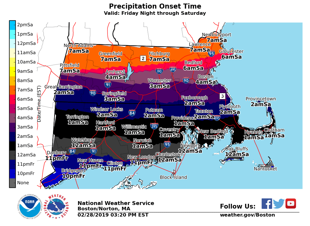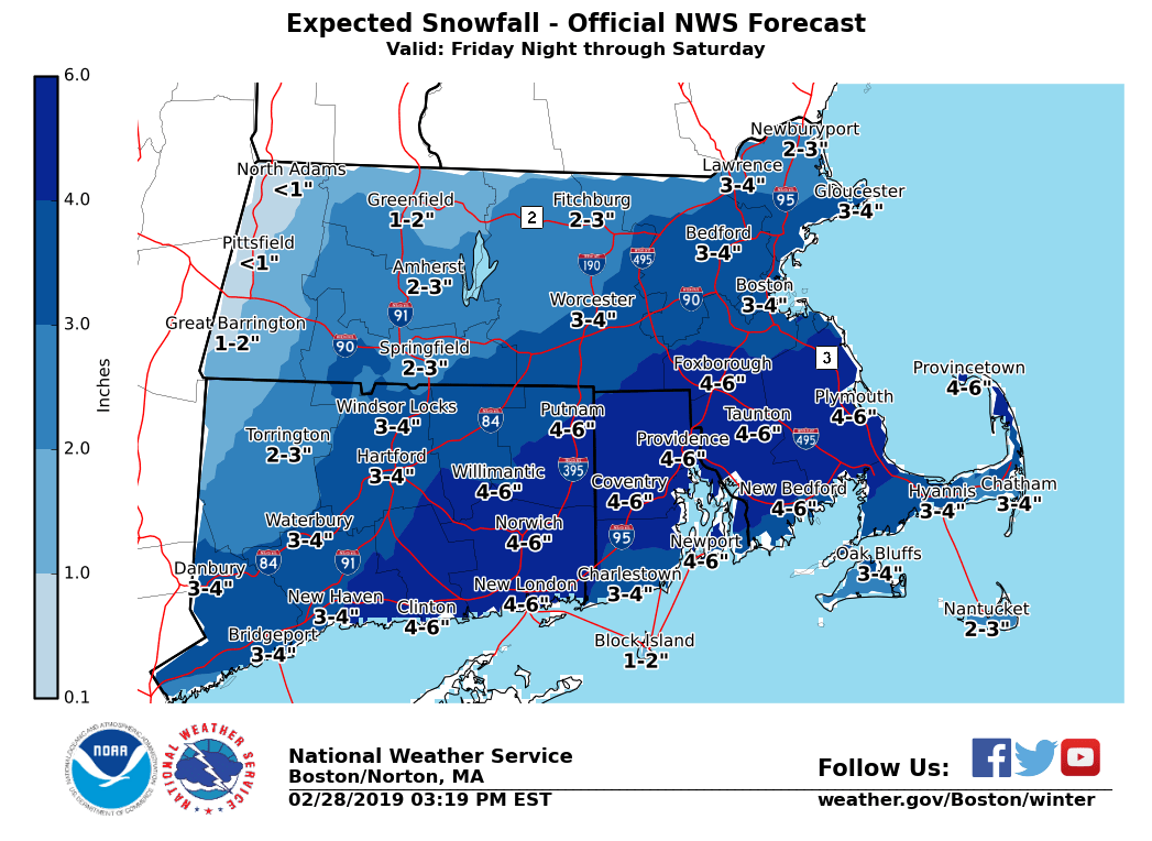 Good Afternoon, We have quite an active pattern this weekend into early next week with the potential for 2 winter storms impacting southern New England. The first storm will be late Friday night into Saturday with the potential for several inches snow accumulation. The second and stronger storm is expected late Sunday into Monday, but there is considerable uncertainty with the storm track. Details below. *Friday night into Saturday...* *What/Where/When:* - Potential snowfall of 3 to 6 inches. - Heaviest snowfall expected across interior RI/SE MA - Snow develops near the south coast after midnight Friday night reaching northern MA toward daybreak Saturday - A brief period of heavy snow with 1-2 inch/hr snowfall rates possible Sat morning across eastern New Eng - Hazardous travel conditions with snow covered roads and poor visibility late Friday night and Saturday morning - Snowfall will be wet and heavy so risk for power outages will increase if amounts reach 6 inches - Some mixing with rain or sleet possible near the immediate south coast and Cape/Islands Saturday - Snow gradually tapers off during Saturday afternoon *Uncertainty:* - Axis of heaviest snowfall can still change and it is possible max snowfall amounts could exceed 6 inches in some locations. - If storm track trends further north, heavier snowfall will shift further in the interior with more rain near the coast. A further south track would result in more of a glancing blow. - Slight cooling in the atmosphere could result in more significant snow accumulation for the Cape/Islands. *Late Sunday into Monday...* *What:* - Significant snow accumulation - Impacts to the Monday morning commute *Where:* - Greatest risk for significant snow will be across the interior, north and west of the Boston to Providence corridor, but significant snow can't be ruled out yet for Boston to Providence *When:* - Snow develops late Sunday and Sunday evening from west to east, possibly heavy at times after midnight - Snow may change to rain in the coastal plain later Sunday night - Precipitation gradually tapers off during Monday *Uncertainty:* - There is still considerable uncertainty with the storm track which will determine where rain-snow line sets up and where axis of heaviest snow occurs - It is still too early to give specific snowfall amounts - We will know more each day but probably will not have higher confidence in snowfall amounts until Saturday If you have any questions or would like more information, don't hesitate to contact us via this email address, on NWSChat <https://nwschat.weather.gov/>, or at the following: National Weather Service Boston/Norton, MA 46 Commerce Way Norton, MA 02766 508.622.3280 Website <http://www.weather.gov/boston> | Facebook <http://www.facebook.com/NWSBoston> | Twitter <http://www.twitter.com/NWSBoston>
