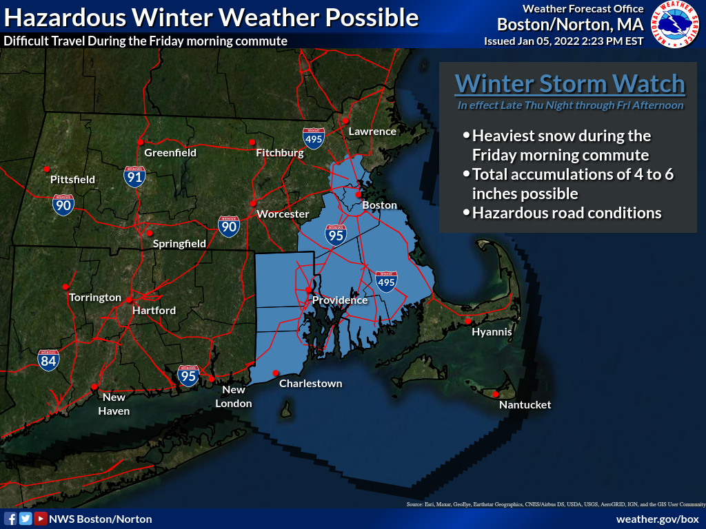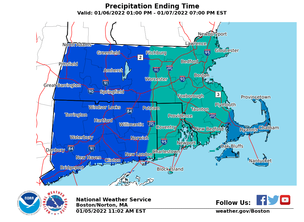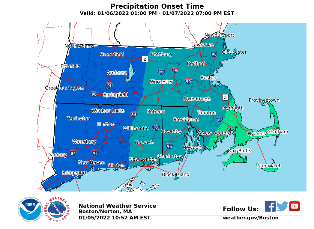 Good Evening All, Apologies that our graphics for onset and end timing omitted the actual times. Please find the correct graphics below. The general start timing overnight Thursday into Friday is between 12 AM and 5 AM from west to east. End timing will vary from 9 AM to 5 PM, west to east, as the storm pulls away Friday. Thank you, If you have any questions or would like more information, don't hesitate to contact us via this email address, on NWSChat <https://nwschat.weather.gov/>, or at the following: National Weather Service Boston/Norton, MA 46 Commerce Way Norton, MA 02766 508.622.3280 Website <http://www.weather.gov/boston> | Facebook <http://www.facebook.com/NWSBoston> | Twitter <http://www.twitter.com/NWSBoston> On Wed, Jan 5, 2022 at 3:40 PM BOX Operations - NOAA Service Account < box.operations@noaa.gov> wrote: