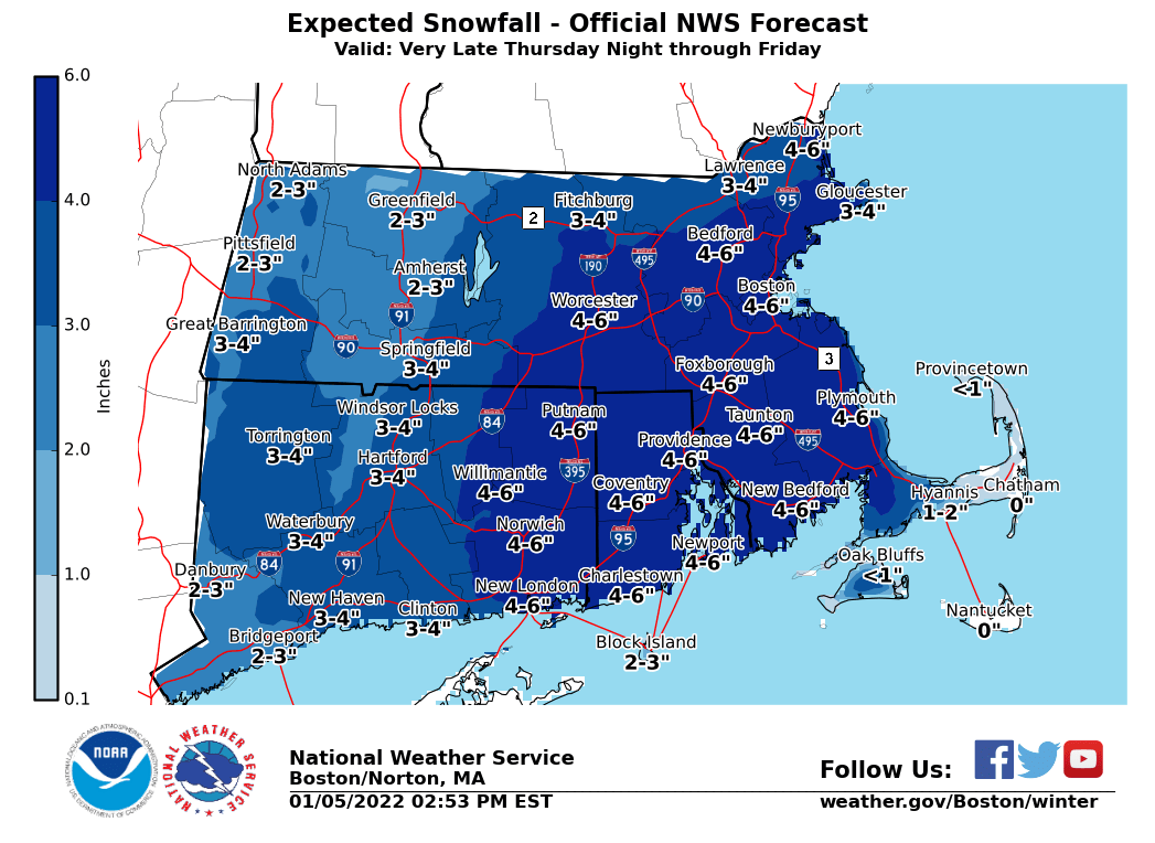 A snowfall map has also been attached for your convenience. Widespread 4-6" snow totals are expected across SE MA and RI. Localized higher amounts are possible.