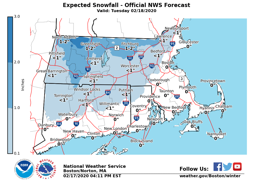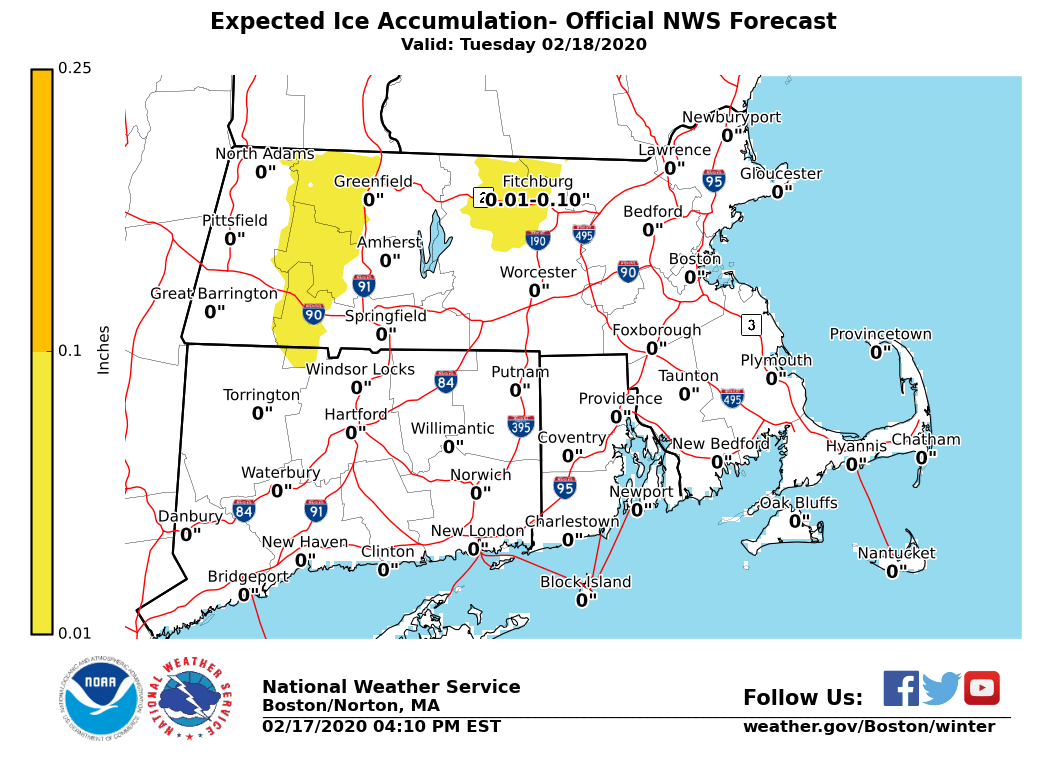 All, *Not* a major or widespread winter weather event Tuesday but some impacts in the form of slippery travel across the Worcester Hills and east slopes of the Berkshires from late morning into the afternoon, especially the highest elevations in these areas. Additional details below. *What ... *A brief period of snow or sleet to light freezing rain before changing over to all rain *Where ...* the Worcester Hills and the east slopes of the Berkshires especially the highest elevations of these areas *When ...* Late Tuesday morning into the afternoon *Impacts ...* a 3 to 6 hour period of snow or sleet to light freezing rain will result in slippery travel especially on untreated surfaces. By 4 or 5 pm, all areas should have changed over to plain rain with temperatures above freezing. So other than possibly a very brief period of snow and/or sleet at the start, rain will be the predominant precipitation type for the cities and suburbs of Boston, Providence and Hartford. Temperatures will be above freezing across these areas so roadways will just be wet. *Forecast Confidence ...* high confidence in a short duration wintry event (3-6 hours) with minor snow accumulations (a coating to 2 inches) and very minor ice accretions (less than 0.05 inches) across western and central Massachusetts. This includes the Worcester Hills and the east slopes of the Berkshires. There is still some uncertainty that impacts could be felt as far south into northwest Hartford county. However, confidence is low at this time. *Attached Graphics ...* - A loop beginning at Tuesday 8 am and ending at 7 pm showing an approximate timeline and precipitation types of snow (blue), a wintry mix (purple) and freezing rain (red) moving across the region tomorrow/Tuesday - Expected snow totals. Only a coating to 2 inches across western and northwest MA. Little, if any snow accumulation elsewhere. - Expected ice accretion. A trace to 0.05 inches with greatest risk across the highest elevations. Little, if any ice accretion elsewhere. Frank Nocera and Rodney Chai If you have any questions or would like more information, don't hesitate to contact us via this email address, on NWSChat <https://nwschat.weather.gov/>, or at the following: National Weather Service Boston/Norton, MA 46 Commerce Way Norton, MA 02766 508.622.3280 Website <http://www.weather.gov/boston> | Facebook <http://www.facebook.com/NWSBoston> | Twitter <http://www.twitter.com/NWSBoston>