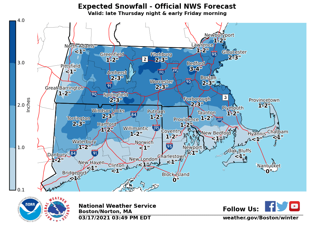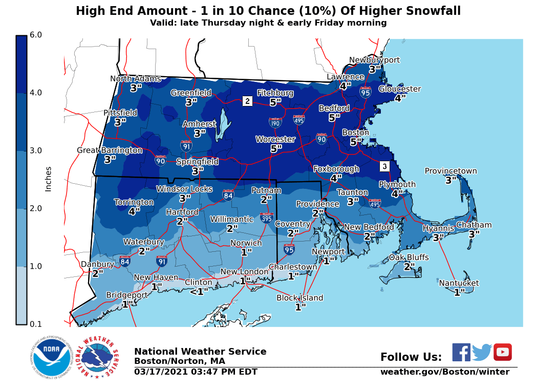 Good afternoon everyone, Attached is a one-page briefing, most likely snowfall (StormTotalSnow), Potential High End Snow Amount (SnowAmt90Prcntl) and maximum wind gusts covering Thursday night into Friday. Not much has changed with a minor snow event likely, 1 to 3 inches with little impact to the Friday morning commute, but the difference of a few degrees in temperature and heavier snow intensity could result in more snow (perhaps 4-6" in some spots with more impact). This really hinges on exact intensity and location of snow bands along with intensity. As of now the most likely scenario is for 1-3", but again a low probability for 4-6". If snow amounts of 4+ inches materializes, then some power outages would be possible. The other concern is for strong northeast winds gusting as high as 45 to 55 MPH along the coast from Plymouth county, Cape Cod and the Islands.. Thus wind advisory has been issued for this area. Gale Warnings have been issued for the coastal waters. Coastal flooding, due to astronomical tides remaining low and only a 1-1.5 ft surge expected, coastal flooding is not expected. Please feel free to contact us with any questions or concerns. Thanks, Frank Nocera & Bryce Williams If you have any questions or would like more information, don't hesitate to contact us via this email address, on NWSChat <https://nwschat.weather.gov/>, or at the following: National Weather Service Boston/Norton, MA 46 Commerce Way Norton, MA 02766 508.622.3280 Website <http://www.weather.gov/boston> | Facebook <http://www.facebook.com/NWSBoston> | Twitter <http://www.twitter.com/NWSBoston>