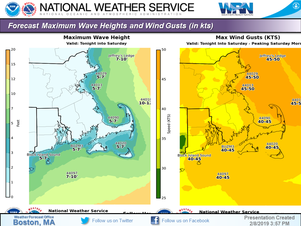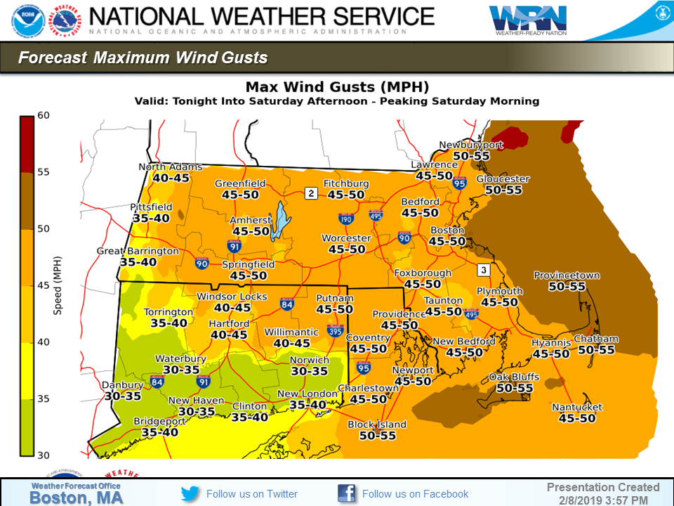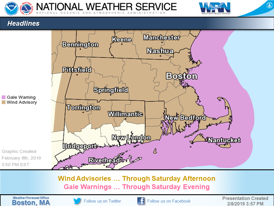 Good afternoon everyone, The primary issue in the near term remains the strong to damaging winds across the region tonight into Saturday: - Wind Advisories continue for all of Southern New England through Saturday afternoon. - Sustained W-NW winds of 20-30 mph with gusts as high as 50 mph are expected. - Strongest winds will be experienced in the higher terrain, the Berkshires/Litchfield Hills, Worcester Hills, as well as along the E MA shorelines. - Expecting the strongest gusts around daybreak into mid morning Saturday. - Scattered tree and branch damage expected along with a risk for power outages. For Mariners, Gale Warnings continue with gusts 45-50 kt and offshore seas around 10ft. Note that the included images are only regarding these winds, not the storm discussed below. We are also monitoring a mixed precipitation winter storm for Tuesday into early Wednesday. Note that there is still some uncertainty, but here are a few things we are watching for: - Starting as a period of at least moderate snowfall around mid day Tuesday. - Gradual change to a wintry mix of sleet and freezing rain from south to north during the late afternoon and evening hours Tuesday. - Some locations across the interior may remain all snow for the whole duration. - The Tuesday afternoon commute will be the most impacted, with the storm ending during the Wednesday morning commute. We will continue to update you on this storm. In the meantime, if you have any questions or comments please reach out at any time. - NWS Boston/Norton If you have any questions or would like more information, don't hesitate to contact us via this email address, on NWSChat <https://nwschat.weather.gov/>, or at the following: National Weather Service Boston/Norton, MA 46 Commerce Way Norton, MA 02766 508.622.3280 Website <http://www.weather.gov/boston> | Facebook <http://www.facebook.com/NWSBoston> | Twitter <http://www.twitter.com/NWSBoston>