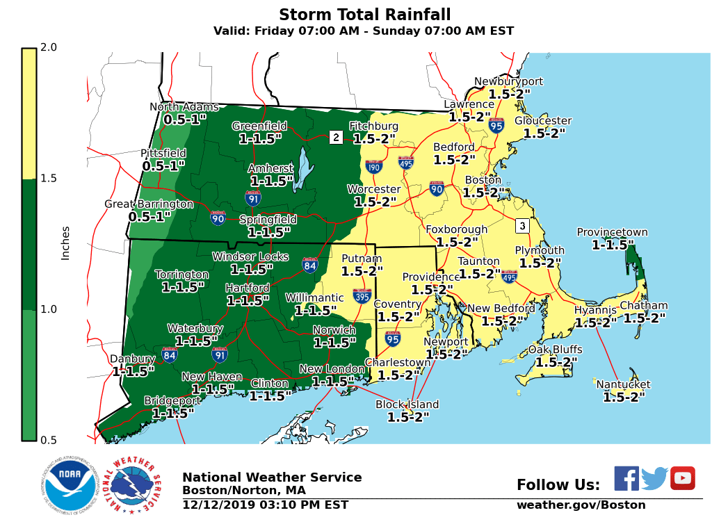Good afternoon, We are expecting a heavy rain event to impact the region late Friday night into Saturday. Precipitation might start off as a bit of freezing rain in the interior high elevations and parts of the CT River valley, but any icing impact will be transient as temperatures warm well above freezing overnight on Friday. *Interior Light Icing:* *Locations*: East slopes of the Berkshires and CT River valley in MA. *Timing:* Spotty freezing drizzle and/or very light freezing rain developing during precipitation onset. Changeover to rain by midnight. *Amounts*: Trace amounts to a couple hundredths of an inch resulting in a light, thin glaze of ice. *Impact*: Slick roads impacting Friday night's travel. *Confidence:* Low. Coverage of freezing drizzle and light freezing rain will be spotty/patchy. *Heavy Rain:* *Locations*: All locations. *Timing:* Late Friday night into Saturday evening. Heaviest between Saturday morning and afternoon. *Amounts*: 0.75 to 1.5 inches in Western MA and CT. 1 to 2 inches in Eastern MA and RI. *Impact*: Combination of snowmelt and heavy rain could result in localized flooding, especially in areas with poor drainage. *Confidence:* High. A storm total rainfall graphic is attached. Please let us know if you have any questions or concerns. This email will be updated as needed. Meteorologist: Rodney Chai and Bryce Williams If you have any questions or would like more information, don't hesitate to contact us via this email address, on NWSChat <https://nwschat.weather.gov/>, or at the following: National Weather Service Boston/Norton, MA 46 Commerce Way Norton, MA 02766 508.622.3280 Website <http://www.weather.gov/boston> | Facebook <http://www.facebook.com/NWSBoston> | Twitter <http://www.twitter.com/NWSBoston>