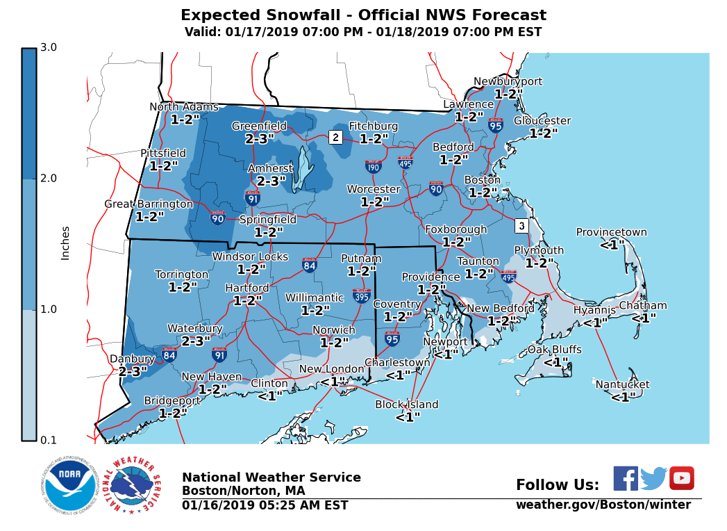 Good morning, all: Just a quick correction to our prior message to include the header for the Friday section for clarity. No other changes have been made. We apologize for the oversight. *Friday:* - Light snow will overspread from west to east during the morning commute. Snowfall rates should generally be light, at or below an inch an hour. - The light snow will continue, with accumulations of up to 3 inches, ending during the late afternoon and evening. Highest totals across northern and western MA/CT, lowest totals across RI and eastern MA. - A change to rain is expected across the coastal plains of MA and RI during mid day into the afternoon. - Some light accumulations possible on untreated surfaces. A preliminary graphic is attached. *Saturday night - Sunday:* - Low confidence in the details at this time. - Precipitation will begin late Saturday evening, overspreading the entire area Saturday night into mid day Sunday. - Tricky precipitation type forecast, potentially starting as period of heavy, wet snow, changing to ice then to heavy rain into the day on Sunday. Timing of these changes will likely take a couple more days to resolve well. - There is a risk for a significant, plow-able snowfall and/or icing. - There is also the low-moderate risk for some areal and river flooding given the snow to rain transition. - We are monitoring the risk of coastal flooding along the South Coast. The period of concern is short, the potential is for minor flooding at worst, and the risk remains low. We will continue to update you as this week progresses and confidence increases. If you have any questions or concerns beyond the scope of this briefing, don't hesitate to reach out to us via any of the means below. - NWS Boston/Norton If you have any questions or would like more information, don't hesitate to contact us via this email address, on NWSChat <https://nwschat.weather.gov/>, or at the following: National Weather Service Boston/Norton, MA 46 Commerce Way Norton, MA 02766 508.622.3280 Website <http://www.weather.gov/boston> | Facebook <http://www.facebook.com/NWSBoston> | Twitter <http://www.twitter.com/NWSBoston>