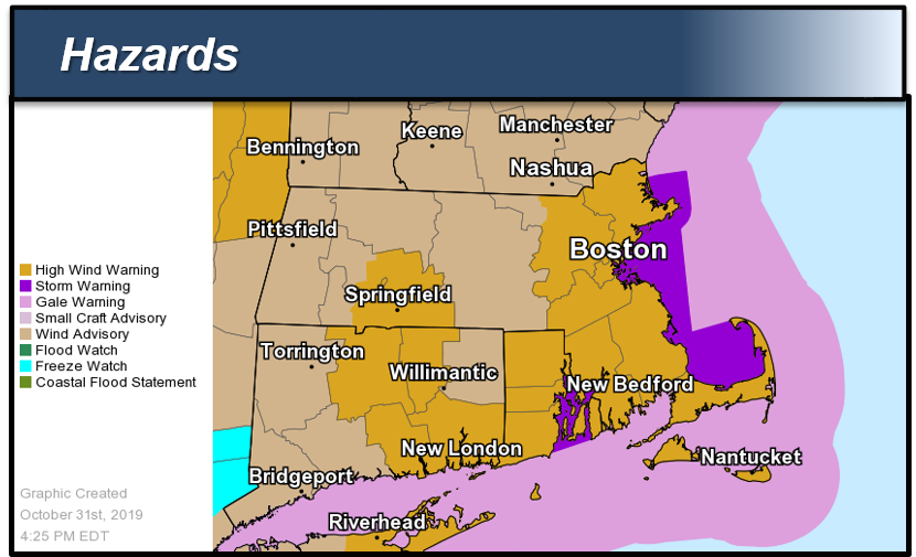 Good afternoon. This is a correction to change the mention of Saturday to Friday. A period of strong to damaging wind gusts are expected tonight into early Friday morning. *Headlines*: - High Wind Warning for easern Hampshire and Hampden counties MA & Hartford and Tolland counties CT from 9 PM tonight through 3 AM Friday morning - High Wind Warning for eastern Massachusetts & Rhode Island from 11 PM tonight through 6 AM Friday morning - Wind Advisory for Windham county CT and Worcester, Franklin, western Hampden and western Hampshire counties from 8 PM tonight through Noon on Friday - Storm Warnings for Narragansett Bay, Boston Harbor, Cape Cod Bay, and Massachusetts/Ipswich Bays in effect from 11 PM tonight through 6 AM Friday morning - Gale Warnings in effect for the remaining coastal waters through Friday *Details*: *Winds:* - *Timing and Peak Gusts:* - Strongest South winds will occur from 9 PM tonight through 8 AM Friday morning from west to east. - Expect gusts from 40-50 mph in the interior, with 50-60 mph possible across Rhode Island and eastern MA, including the Cape/Islands. - Another surge of strong west wind gusts to 40-50 mph are expected Friday morning, especially over the higher terrain in interior MA. - *Impacts:* Some tree damage with scattered power outages. - *Uncertainty:* There is still some uncertainty about how much of the strongest winds will mix to the ground. However, with temperatures in the upper 60s to lower 70s this afternoon, the probability for the strong winds to reach the surface is high. There will also be a narrow line of heavy showers along the front, which will increase the likelihood of strong to damaging winds. *Rain:* - *Timing:* Expect areas of showers tonight and Thursday, but the heaviest rainfall, possibly accompanied by a rumble or two of thunder, will occur across western and central MA and northern CT. - *Amounts:* 0.5 to 1.25 inches, heaviest across western Hampden, Hampshire and Franklin counties. - *Impacts*: Limited. Isolated poor drainage flooding possible from leaf-clogged storm drains. - *Uncertainty*: Any thunder may enhance rainfall rates. The updated graphics for the peak wind gusts (in MPH) and current headlines are attached. If you have any questions or would like more information, don't hesitate to contact us via this email address, on NWSChat <https://nwschat.weather.gov/>, or at the following: National Weather Service Boston/Norton, MA 46 Commerce Way Norton, MA 02766 508.622.3280 Website <http://www.weather.gov/boston> | Facebook <http://www.facebook.com/NWSBoston> | Twitter <http://www.twitter.com/NWSBoston>