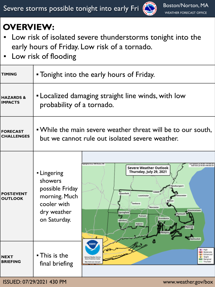[07.29.21 PM] NWS Boston EM Briefing - Isolated Strong to Severe Thunderstorms Possible Late Tonight Into Early Friday