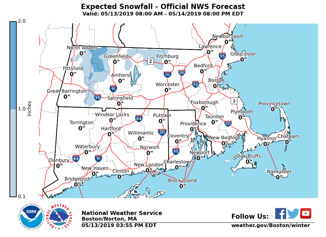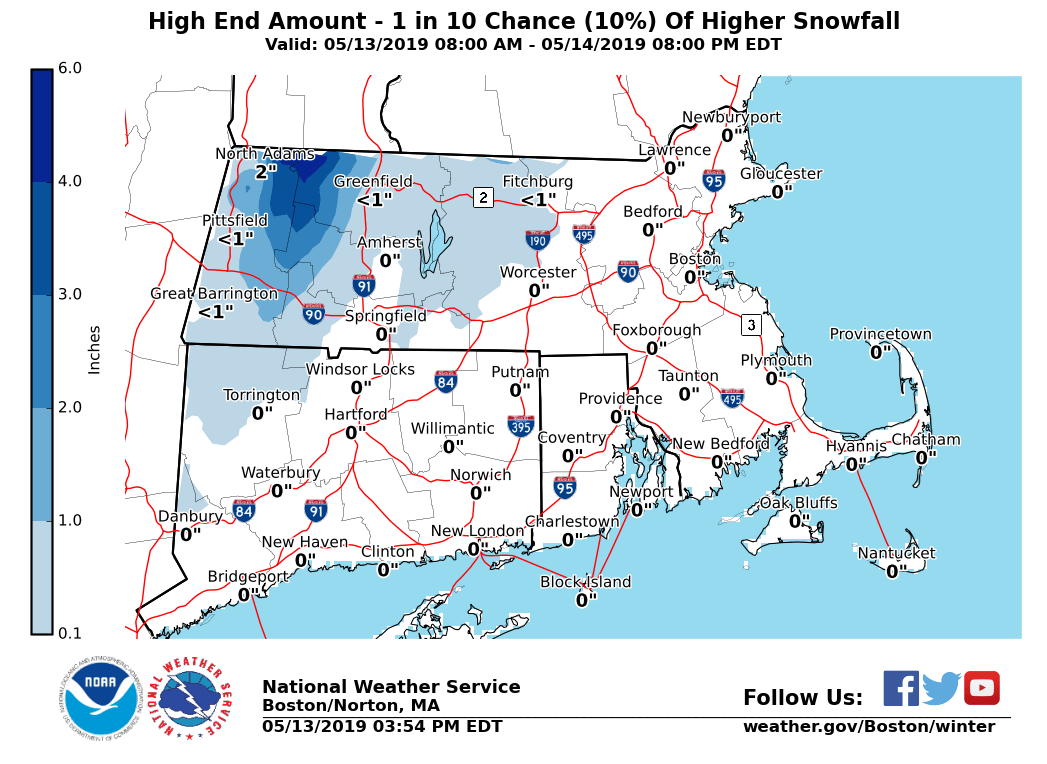 Good afternoon, Our wet weather pattern will continue tonight into Tuesday morning. Temperatures will be low enough to support some wet snow mixing in with rain across the highest terrain towards the Berkshires as early as between 8-10 PM this evening. Snow will become more likely between midnight and 6 AM Tuesday. Any lingering snow should transition to all rain by 9 AM. Light snow accumulations are possible as low as 1,000 feet of elevation, but are most likely from 1,500 feet or higher. We have attached the most likely and reasonable worst-case scenario snowfall accumulations. Matthew Belk If you have any questions or would like more information, don't hesitate to contact us via this email address, on NWSChat <https://nwschat.weather.gov/>, or at the following: National Weather Service Boston/Norton, MA 46 Commerce Way Norton, MA 02766 508.622.3280 Website <http://www.weather.gov/boston> | Facebook <http://www.facebook.com/NWSBoston> | Twitter <http://www.twitter.com/NWSBoston>