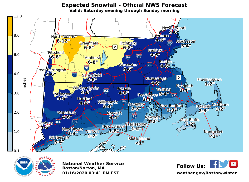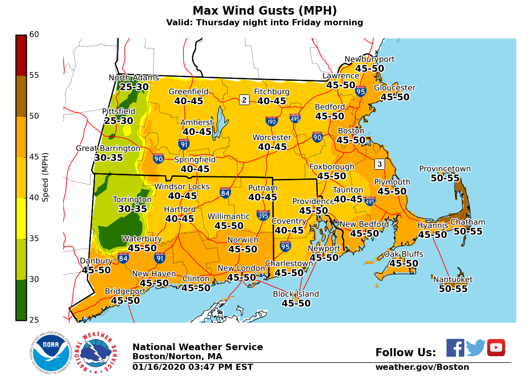 Good afternoon everyone, We are still looking at some weather concerns the next few days. See below and the attached images for more details. New: Preliminary snowfall map included for Saturday afternoon into early Sunday *Strong winds continuing through early Friday morning:* *What/Where:* Northwest gusts up to 35 mph inland and 45 mph along the coast. A Wind Advisory is in effect for all of southern New England. *Impacts:* Some tree damage with isolated power outages. *Cold Wind Chills Tonight into Friday Morning:* *What/Where:* Wind chills near zero across all of southern New England. A few spots across northwest Connecticut, central and western Massachusetts could see wind chills fall to 5 to 15 below zero. *Impacts:* Prolonged exposure could lead to cold related health impacts. *Potential for accumulating snow Saturday afternoon/night:* *What/Where/When:* - Plowable snow accumulations possible away from immediate south coast. - Several inches possible across interior northern and NW MA where the highest totals are expected. - Snow develops Saturday afternoon from west to east, likely changing to a wintry mix and eventually rain along the coast in the evening. Expect this mix/rain-snow line to advance north across the region during the night. - Precipitation ending late Saturday night into early Sunday morning. - Potential for high snowfall rates Saturday evening. *Uncertainty:* - Timing of the changeover and how far north the mix/rain-snow line gets is uncertain and will impact specific totals. - Moderate to high confidence in a period of accumulating snow but specific amounts uncertain. Please let us know if you have any questions or concerns! Meteorologists: Rodney Chai and Bryce Williams If you have any questions or would like more information, don't hesitate to contact us via this email address, on NWSChat <https://nwschat.weather.gov/>, or at the following: National Weather Service Boston/Norton, MA 46 Commerce Way Norton, MA 02766 508.622.3280 Website <http://www.weather.gov/boston> | Facebook <http://www.facebook.com/NWSBoston> | Twitter <http://www.twitter.com/NWSBoston>
