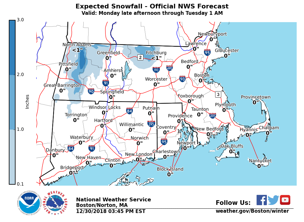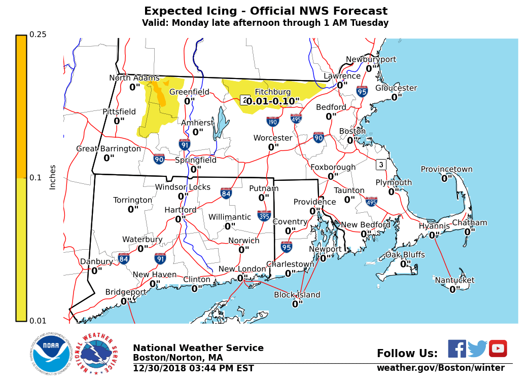 Hello, A storm moving up through the Midwest and St Lawrence Valley will bring rain to Southern New England from Monday late-afternoon through Tuesday morning. Cold air at the start of the storm may cause areas of snow, freezing rain, and sleet during Monday night. Rising temperatures overnight will change all precipitation to rain. Most at risk : East Slopes of the Berkshires, Worcester Hills. Also of concern : Northern Connecticut, Northern Rhode Island, Northeast Massachusetts. Starting time : Monday around 4 PM in the west, 5 PM Central Hills, 6-7 PM in the east. Concerns : Plan on slippery road and walkway conditions during the Monday night celebrations. Ending time : Monday Night 8 PM to Midnight from south to north. If you have any questions or would like more information, don't hesitate to contact us via this email address, on NWSChat <https://nwschat.weather.gov/>, or at the following: National Weather Service Boston/Norton, MA 46 Commerce Way Norton, MA 02766 508.622.3280 Website <http://www.weather.gov/boston> | Facebook <http://www.facebook.com/NWSBoston> | Twitter <http://www.twitter.com/NWSBoston>