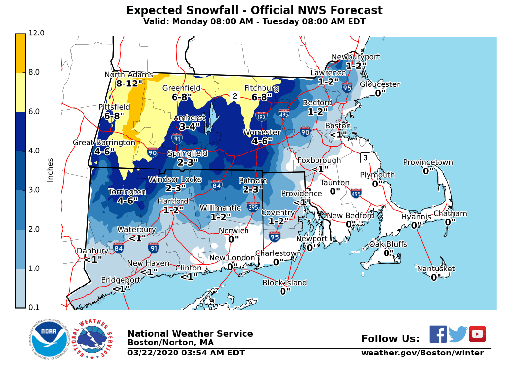 Good morning everyone, Here is the latest thinking about the coastal storm which will pass southeast of New England Late Monday into Tuesday. It will bring snow to much of the area Monday afternoon before a change to rain Monday night. The key takeaway is that this is expected to be a minor snowfall event, with the exception of the higher elevations of western and central Massachusetts, where as much as 8 inches of snow is possible. Changes: - Increased snowfall amounts in the high elevations - Winter Storm Watch issued for the Berkshires and northern Worcester Hills *What/Where/When:* - Snow develops across much of southern New England Monday afternoon, except near the South Coast, Cape Cod, and the Islands where mainly rain is expected. - Snow should be briefly heavy late Monday afternoon and early Monday evening before changing to rain from south to north. Only the higher elevations of northern Worcester County and near the Berkshires are expected to remain all snow. - Accumulations of a slushy inch or two are expected in the Providence and Boston areas, 2-4" in the Hartford/Springfield area and near the I-495 corridor in northeast Massachusetts, and 5-8" in the higher elevations in the Berkshires and in northern Worcester County. - The consistency of the snow will be heavy and wet in all areas. *Uncertainty:* - If the coastal storm passes farther offshore, snowfall totals will be less, especially across the interior. - Conversely, if the storm tracks closer to southern New England, there would be less snow across most of the region, since the higher accumulations would shift to the northwest of Massachusetts. Thanks, Bryce Williams and Bill Babcock If you have any questions or would like more information, don't hesitate to contact us via this email address, on NWSChat <https://nwschat.weather.gov/>, or at the following: National Weather Service Boston/Norton, MA 46 Commerce Way Norton, MA 02766 508.622.3280 Website <http://www.weather.gov/boston> | Facebook <http://www.facebook.com/NWSBoston> | Twitter <http://www.twitter.com/NWSBoston>