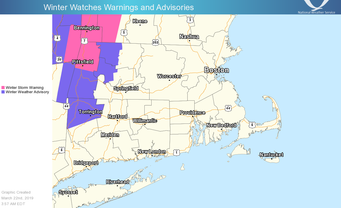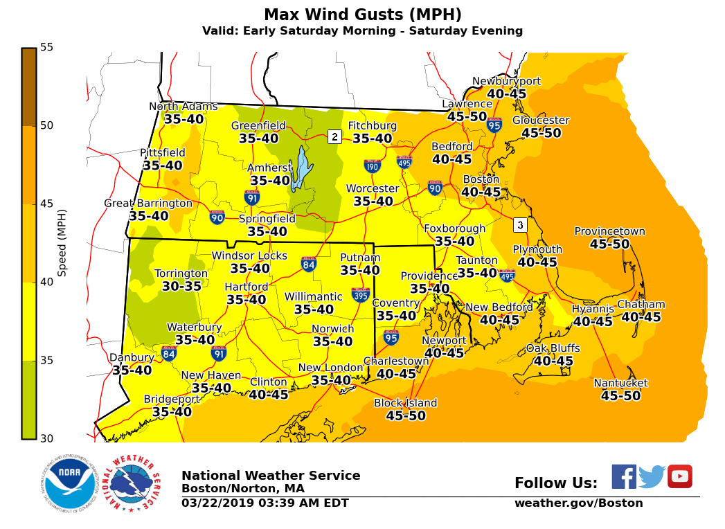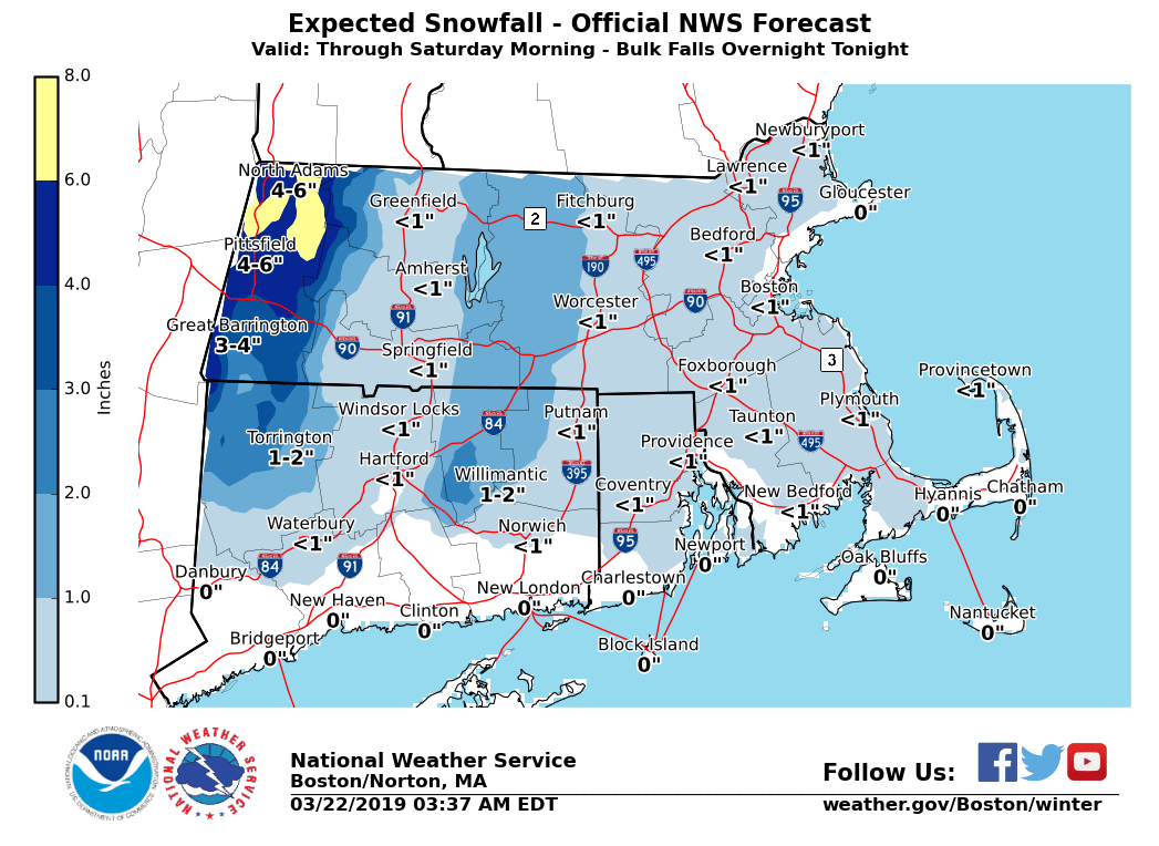Good morning everyone, A transition from heavier rain to light snow across the high terrain and damp conditions elsewhere is expected this morning. There is no change to headlines with this morning's update. *Winter Weather:* - Light snow will linger across the higher elevations of western MA and CT through the day. - Accumulations of a coating to 2 inches across the lower elevations, with the potential of 4 to 8 inches over the highest terrain especially across northwest Franklin county, tonight. - The bulk of the accumulations occur during the overnight hours tonight. - Potential for localized power outages where snowfall exceeds 5 inches *Coastal Flooding:* - Minor coastal flooding along the eastern Massachusetts coast during high tide early this afternoon. - Some vulnerable shore roads may experience minor flooding around high tide. *Winds:* - Winds will increase late tonight into Saturday. - Sustained westerly winds 15-25 mph with gusts 35-45mph are possible during the day Saturday. - Some isolated tree damage and power outages are possible. *Marine:* - Strong West wind gusts to 40 knots develop late Friday and continue through midday Saturday - Seas will build to 10 to 15 feet offshore If you have any questions or would like more information, don't hesitate to contact us via this email address, on NWSChat <https://nwschat.weather.gov/>, or at the following: National Weather Service Boston/Norton, MA 46 Commerce Way Norton, MA 02766 508.622.3280 Website <http://www.weather.gov/boston> | Facebook <http://www.facebook.com/NWSBoston> | Twitter <http://www.twitter.com/NWSBoston>