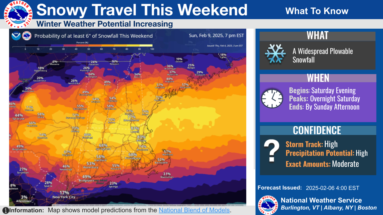 Good morning, all: Attached is our final briefing for today's storm, unless there are significant changes needed. Also attached is an updated graphic on the weekend snowfall potential. Latest indications are that colder air will remain in place. Thus, the probabilities for at least a plowable snowfall had increased as of this writing. Matthew Belk If you have any questions or would like more information, please don't hesitate to contact us. You can reach us via: email: box.operations@noaa.gov phone: 508.622.3280 Slack/NWSChat 2.0 <https://nwschatws.slack.com/> (for approved partners) social media: Website <http://www.weather.gov/boston> | Facebook <http://www.facebook.com/NWSBoston> | Twitter <http://www.twitter.com/NWSBoston>