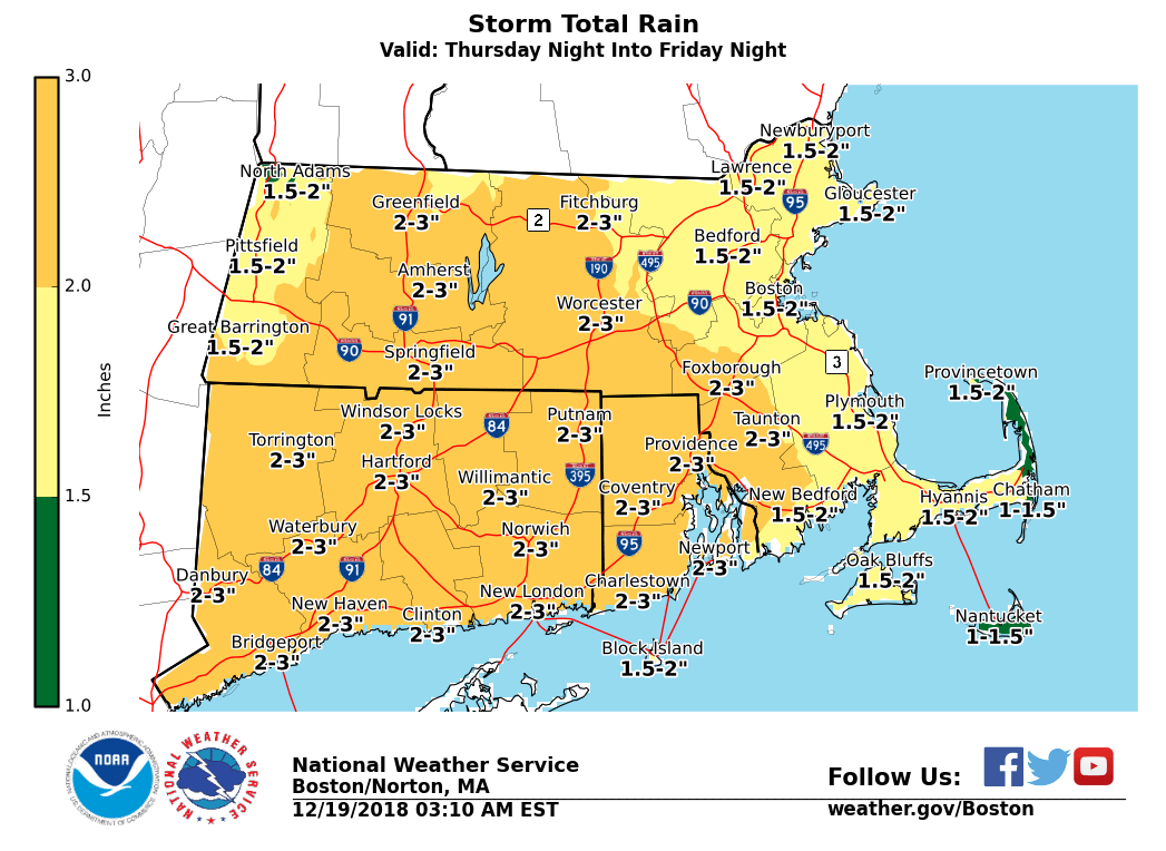 Good morning everyone, No significant changes to the forecast for late Thursday night into Friday. Heavy rain, strong winds and a risk for coastal flooding remain the primary concerns. At this time, only a Gale Watch for the waters has been issued beginning early Friday morning, however it is possible more headlines will be issued. *What / Where / When ...* - Heavy rainfall across all Southern New England - Rain starts late Thursday night, with heaviest rainfall expected early Friday into Friday afternoon, possibly lingering into Friday evening. - Rainfall amounts of 1.5 to 3 inches, with locally higher amounts possible. - Heavy rainfall will likely result in urban and poor drainage flooding, along with some river flooding as well. Moderate river flooding is possible if rainfall approaches 3 inches. - Strong southerly winds - The greatest risk for strong to damaging winds will be across SE New Eng, particularly RI and southeast MA and Cape/Islands during the daylight hours Friday, possibly into Friday evening. - Potential for wind gusts over 50 mph. - If strong winds are realized, tree damage and isolated to scattered power outages will be possible. - Minor coastal flooding along the south coast - Mainly during the early Friday evening high tide. - Storm surge around 2 ft possible with 12+ foot seas just offshore. - Minor flooding possible along the shores of Narragansett Bay and Buzzards Bay, as well as splashover and minor flooding along ocean exposed south coastal beaches. *Uncertainty ...* - Heavy rainfall: High confidence that heavy rainfall will occur, but there is uncertainty with respect to where the axis of heavy rainfall will set up and timing of the heaviest rainfall. - Strong winds: Uncertainty in the strength of the winds along the south coast and extent of any wind damage, and also the timing of the strongest winds. - Coastal flooding: There is uncertainty if there will be enough storm surge during the Friday evening high tide to produce minor flooding. We will continue to update over the next 48 hours. If you have any questions or would like more information, don't hesitate to contact us via this email address, on NWSChat <https://nwschat.weather.gov/>, or at the following: National Weather Service Boston/Norton, MA 46 Commerce Way Norton, MA 02766 508.622.3280 Website <http://www.weather.gov/boston> | Facebook <http://www.facebook.com/NWSBoston> | Twitter <http://www.twitter.com/NWSBoston>