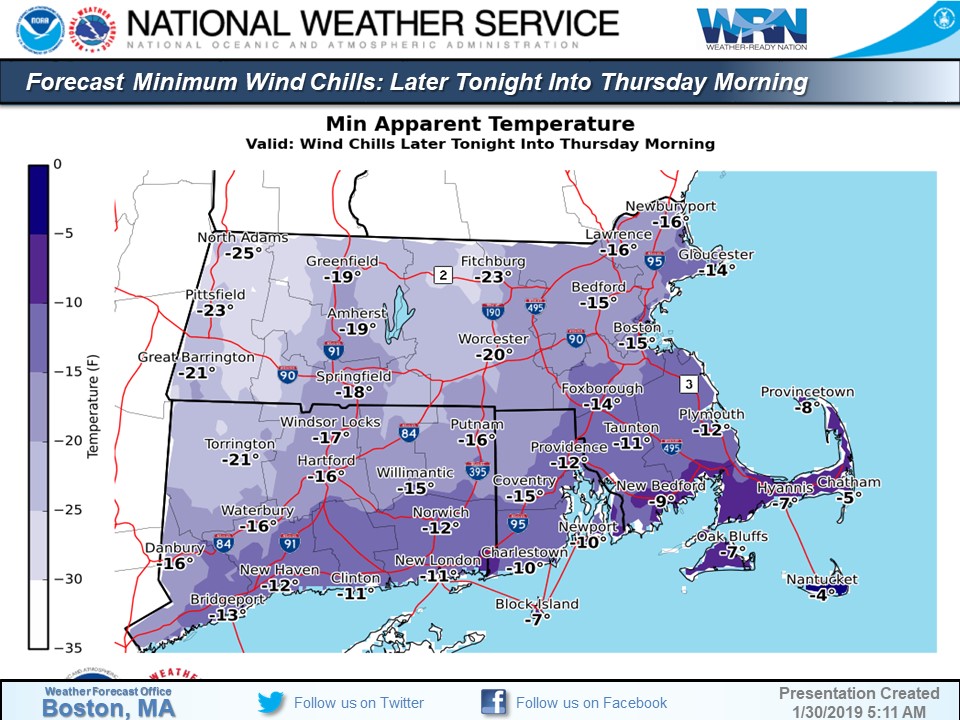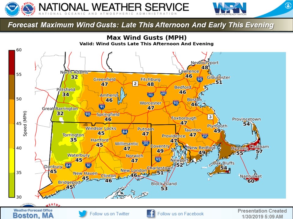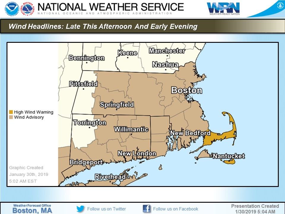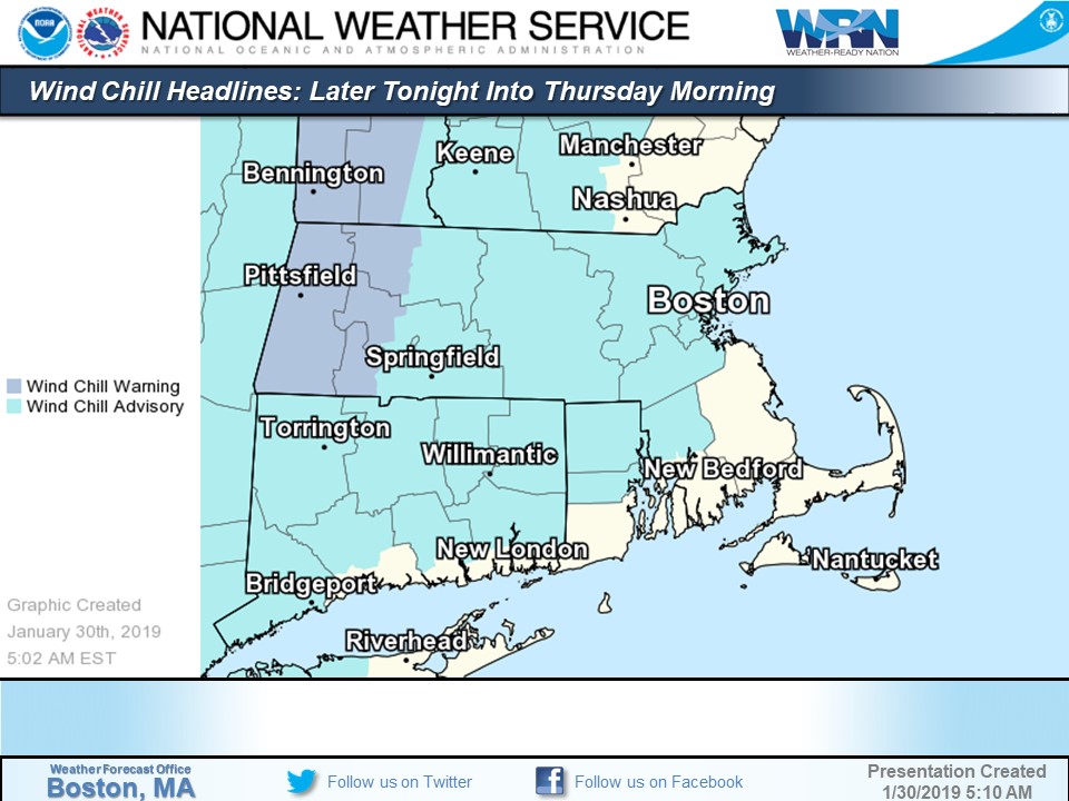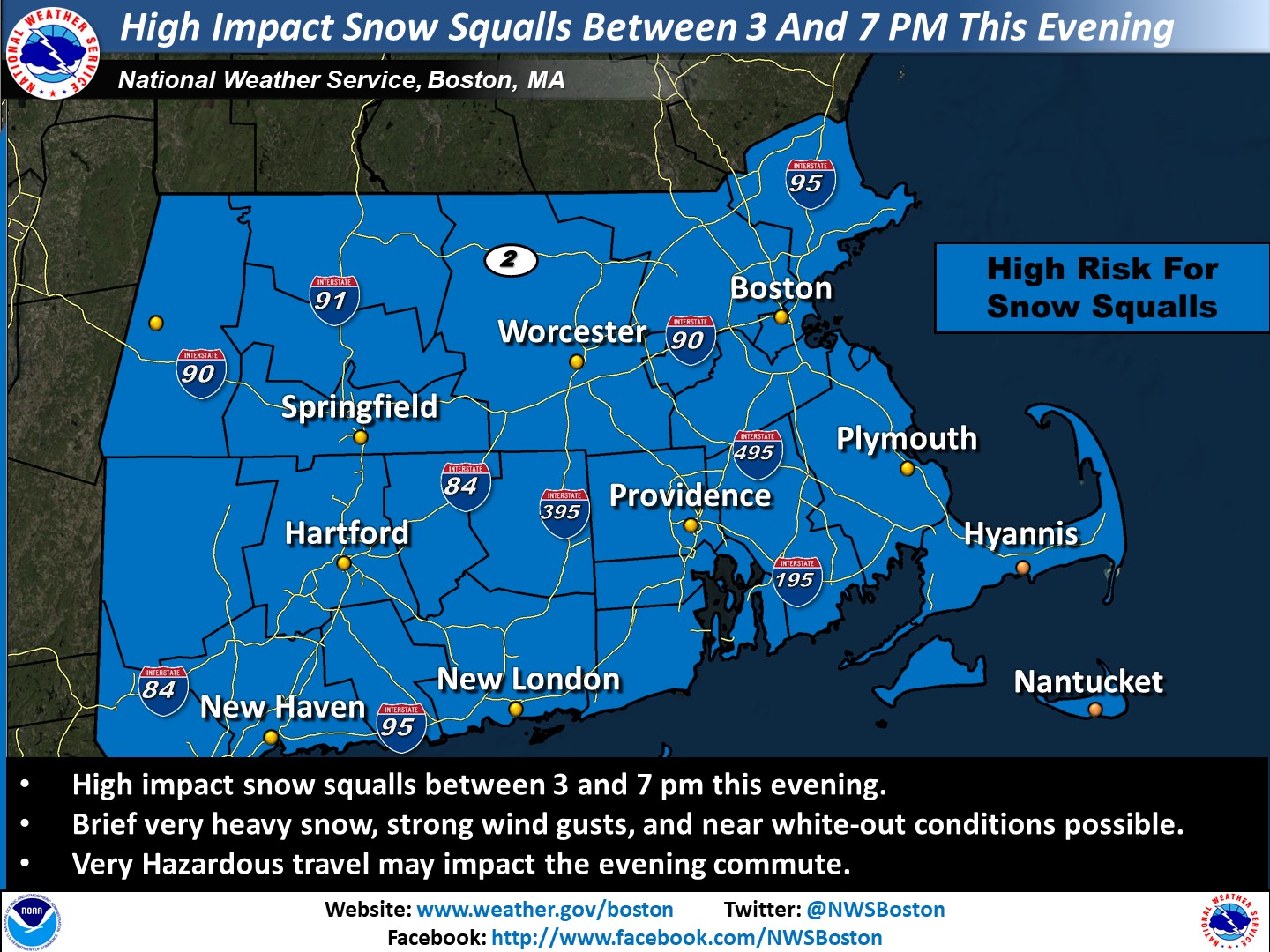 Good morning everyone. While the rain/snow is ending in time for the morning rush hour, untreated roads will be snow covered and slippery across interior southern New England. In addition, temperatures falling below freezing along the Boston to Providence corridor may result in some black ice for the morning commute. Otherwise, the main focus will be for high impact snow squalls late this afternoon and early this evening followed by bitterly cold wind chills. Will highlight the main concerns in the email and also attach a few images. *High Impact Snow Squalls Between 3 and 7 PM This Evening Along With Brief Strong To Perhaps Damaging Wind Gusts:* - Scattered to numerous snow squalls cross western MA/northern CT between 3 and 5 pm and eastern MA/RI between 5 and 7 pm this evening. - Brief very heavy snow, near white-out conditions and strong to perhaps damaging wind gusts anticipated. Very hazardous travel for parts of the evening rush hour. - Snow Squalls last less than 30 minutes in most locations but drop a quick coating to 1.5 inches of snow. Very localized 2-3" amounts can not be ruled out in the heaviest squalls. - Brief 40 to 60 mph wind gusts possible with the heaviest snow squalls. Localized tree damage/isolated power outages possible. - High Wind Warnings posted for the Cape/Nantucket with Wind Advisories for most other locations in southern New England. *Bitterly Cold Wind Chills Later Tonight into Thursday Morning:* - Wind chills drop to between 10 and 25 below zero late tonight into Thursday morning and near 30 below zero across the Berkshires. - Wind Chill Advisories posted along and northwest of the Boston to Providence corridor with Wind Chill Warnings in the Berkshires. *Marine Headlines:* - Gale and Storm Warnings hoisted for 40 to 50 knot wind gusts later today and especially this evening. - Moderate to heavy freezing spray expected later tonight into Thursday night. Freezing Spray Advisories and Warnings Are Posted/ Please let us know if you have any questions or concerns. Thank You Meteorologist: Hayden Frank If you have any questions or would like more information, don't hesitate to contact us via this email address, on NWSChat <https://nwschat.weather.gov/>, or at the following: National Weather Service Boston/Norton, MA 46 Commerce Way Norton, MA 02766 508.622.3280 Website <http://www.weather.gov/boston> | Facebook <http://www.facebook.com/NWSBoston> | Twitter <http://www.twitter.com/NWSBoston>