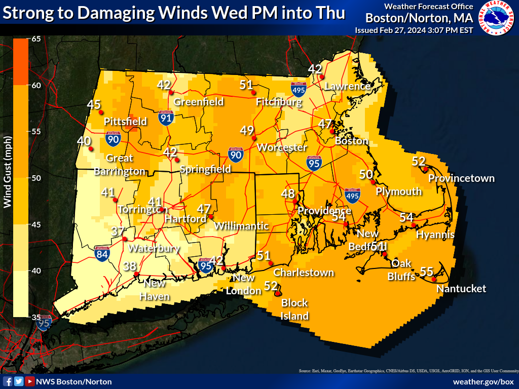 Good afternoon, Attached is our latest weather briefing. *What has changed:* - High Wind Warning in effect for Cape Cod and the islands - High Wind Watch has been expanded into northern Worcester county - Wind Advisory expanded into all of northern CT, including Hartford county - Wind Advisory expanded from southern Worcester, Middlesex & Essex counties Two surges of very strong to damaging winds remain in the forecast. The first surge will be Wednesday afternoon into early evening, with very strong to damaging south winds. The second surge of wind will occur later Wednesday evening into Thursday morning, with strong to damaging northwest winds. The long duration of south winds may enhance the wind damage potential across Cape Cod and the islands. Hence, the upgrade to a High Wind Warning for those locations. Heavy windswept rain will likely cause hazardous travel Wednesday night. Rain briefly turns to snow, as temperatures crash into the 30s and 20s behind the cold front Wednesday night. Any snow accumulations will be less than an inch, except 1-2" possible in the Berkshires. However, subfreezing temperatures combined with any residual/leftover road moisture, may yield slippery travel Wednesday night into Thursday morning. Kevin Cadima, Bill Leatham & Frank Nocera If you have any questions or would like more information, please don't hesitate to contact us. You can reach us via: email: box.operations@noaa.gov phone: 508.622.3280 Slack/NWSChat 2.0 <https://nwschatws.slack.com/> (for approved partners) social media: Website <http://www.weather.gov/boston> | Facebook <http://www.facebook.com/NWSBoston> | Twitter <http://www.twitter.com/NWSBoston>