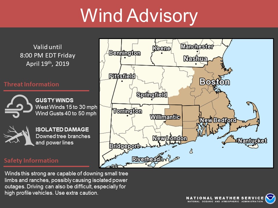 - Gusty SW winds: - A WIND ADVISORY remains in effect for eastern and southeastern MA as well as all of RI into early evening. - Southwest winds sustained around 15 to 25 mph with gusts up to 50 mph. - Already have received several reports across the advised area of downed limbs. The threat for downed limbs continue, possibly small trees as well.