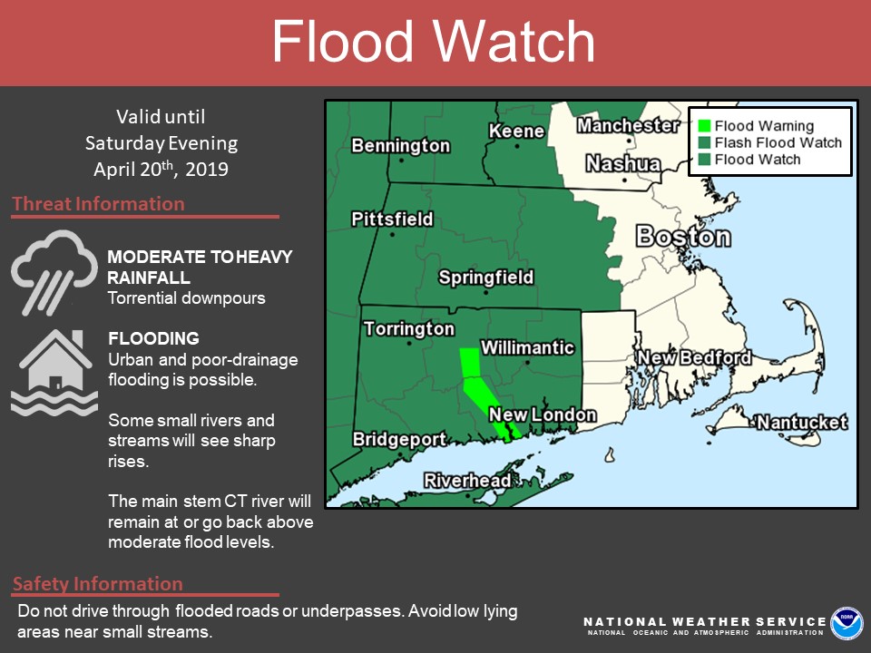 - With the possibility of urban and poor-drainage flooding, the FLOOD WATCH continues for western and central MA, all of CT where heaviest rainfall is forecast (please see the attached *storm total rainfall* image).