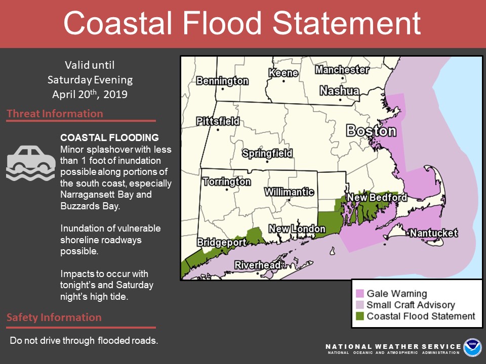 - Strong southerly winds will result in a storm surge of up to 1 foot. Coincident with high astronomical tides, the threat of minor splashover remains possible along portions of the south coast of RI and MA, especially Narragansett Bay and Buzzards Bay. - A COASTAL FLOOD STATEMENT remains in effect for tonight and again Saturday night during peak high tides.